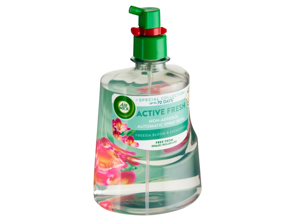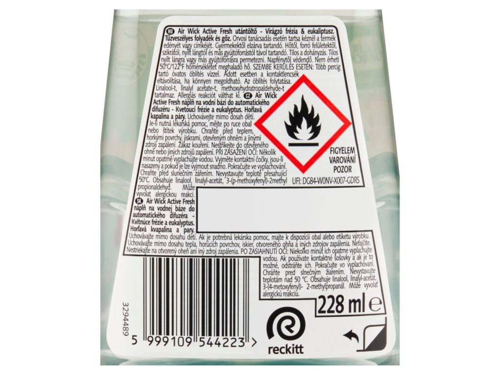 Náplň do osvěžovače vzduchu vůně: kvetoucí frézie a eukalyptus složení na vodní bázi s přírodními esenciálními oleji s molekulami neutralizující zápach bez ftalátů, hnacích plynů a barviv AIR WICK Active Fresh náplň na vodní bázi do automatického difuzéru se nese v duchu ekologie, jelikož do vašeho automatického difuzéru pouze doplníte náplň a můžete ho užívat směle dál. Užijte si okouzlující vůně s přírodními esenciálními oleji. Receptura je obohacena o molekuly neutralizující zápach, které se účinně vypořádají s nepříjemnými pachy. Složení na vodní bázi je výsledkem promyšleného výběru přísad: bez ftalátů, hnacích plynů a barviv.