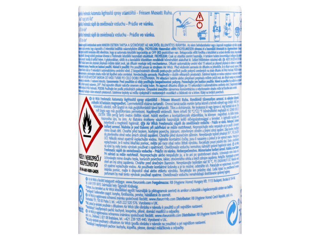 Extrémně hořlavý aerosol. Nádoba je pod tlakem: při zahřívání se může roztrhnout. Nepropichujte nebo nespalujte ani po použití. Uchovávejte mimo dosah dětí. Chraňte před teplem, horkými povrchy, jiskrami, otevřeným ohněm a jinými zdroji zapálení. Zákaz kouření. Nestříkejte do otevřeného ohně nebo jiných zdrojů zapálení. Chraňte před slunečním zářením. Nevystavujte teplotě přesahující 50 °C. PŘI ZASAŽENÍ OČÍ: Několik minut opatrně vyplachujte vodou. Vyjměte kontaktní čočky, jsou-li nasazeny a pokud je lze vyjmout snadno. Pokračujte ve vyplachování. Je-li nutná lékařská pomoc, mějte po ruce obal nebo štítek výrobku. Obsahuje cis-4-terc.butylcyklohexyl-acetát. Může vyvolat alergickou reakci. Osoby s přecitlivělostí na vůně by měly tento výrobek používat s opatrností. Osvěžovače vzduchu nemohou nahradit správné hygienické návyky. Extrémní teploty se mohou vyskytnout v motorech automobilů a v blízkosti kamen nebo krbů. Nestříkejte na elektrická kamna, zdroje tepla a elektrická zařízení. Uchovávejte mimo dosah plamene, svíček, cigaret, zdrojů vznícení, zdrojů tepla, jakýchkoliv elektrických zařízení jako je televizor apod. Pokud budete mimo domov déle než týden, vypněte strojek otočením kontrolního kolečka zcela vlevo na zadní straně (toto vymaže nastavení intenzity vůně). V průběhu použití výrobku nestrkejte prsty nebo jiné předměty do strojku. V některých místnostech jako je zimní zahrada/skleník mohou být vysoké teploty.