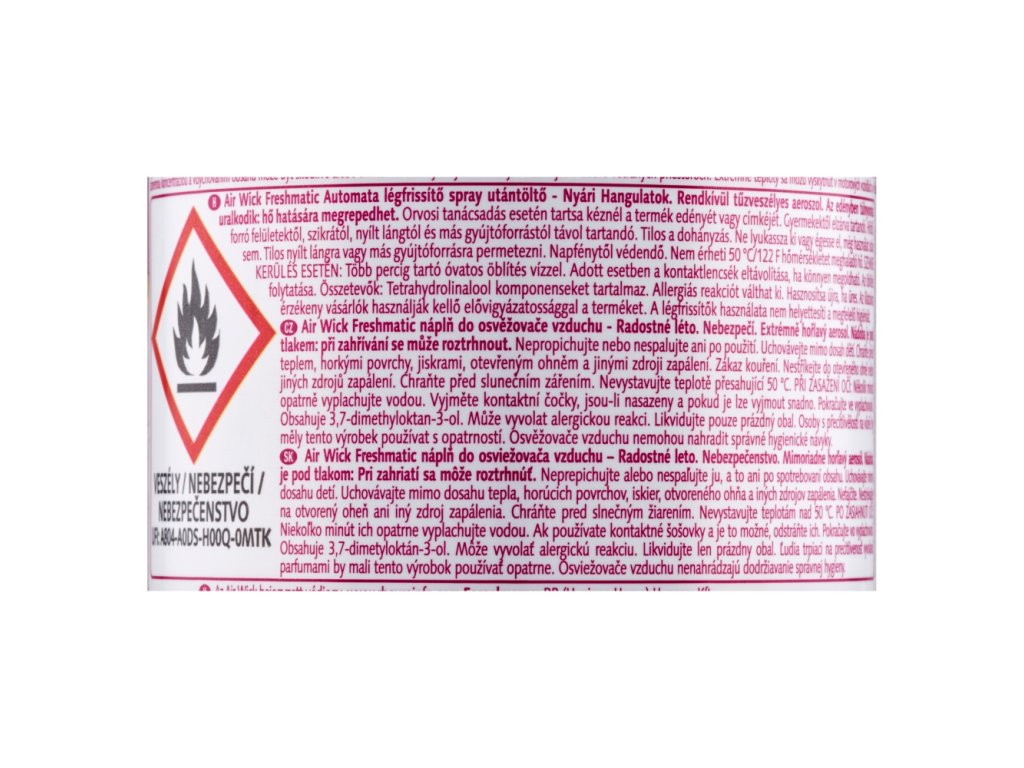 Extrémně hořlavý aerosol. Před použitím si přečtěte údaje na štítku. Pozorně čtěte a dodržujte instrukce na aerosolové náplni. Nádoba je pod tlakem: při zahřívání se může roztrhnout. Je-li nutná lékařská pomoc, mějte po ruce obal nebo štítek výrobku. Uchovávejte mimo dosah dětí. Chraňte před teplem, horkými povrchy, jiskrami, otevřeným plamenem a jinými zdroji zapálení. Zákaz kouření. Nepropichujte nebo nespalujte ani po použití. Chraňte před slunečním zářením. Nevystavujte teplotě přesahující 50 °C/ 122 °F. Nestříkejte do otevřeného ohně nebo jiných zdrojů zapálení. PŘI ZASAŽENÍ OČÍ: Několik minut opatrně oplachujte vodou. Vyjměte kontaktní čočky, jsou-li nasazeny a pokud je lze vyjmout snadno. Pokračujte ve vyplachování. Osoby s přecitlivělostí na vůně by měly tento výrobek používat s opatrností. Osvěžovače vzduchu nemohou nahradit správné hygienické návyky. Používejte pouze v dobře větraných prostorách.