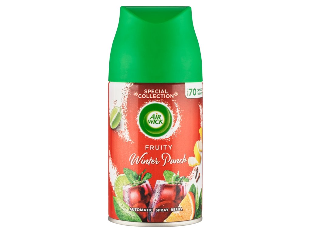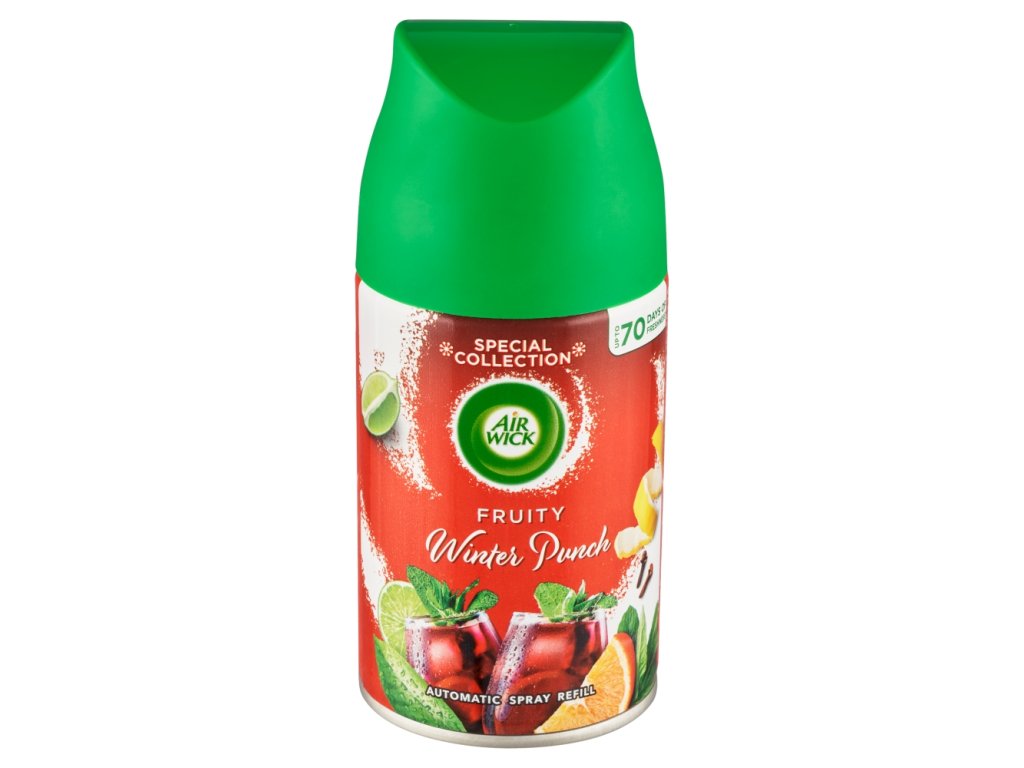 Air Wick Náhradní náplň Fruity Winter Punch 250 ml je osvěžovač vzduchu navržený pro použití s automatickým difuzérem Air Wick Freshmatic. Tato náplň uvolňuje příjemnou vůni ovocného punče, která navodí atmosféru zimních svátků a příjemně provoní váš domov.