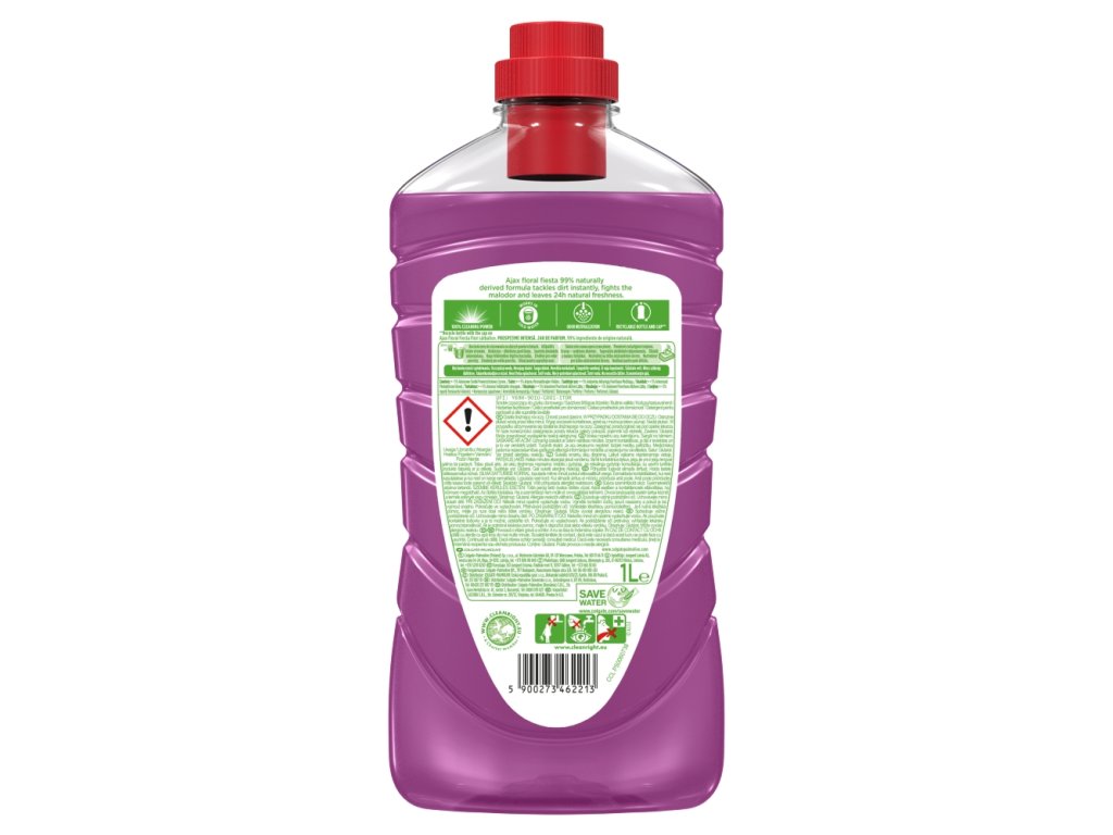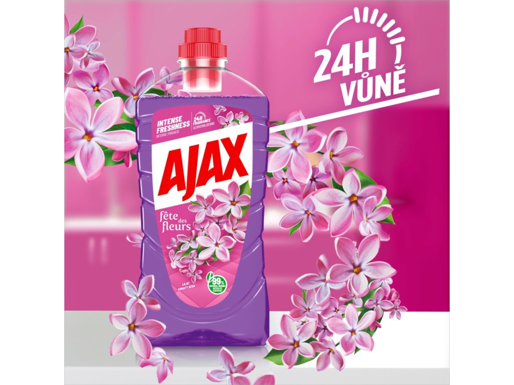 Ajax Floral Fiesta Lilac Breeze je čisticí prostředek na všechny povrchy s jedinečnou vůní, která je aktivována na vzduchu, je obohacená přirozenými květinovými výtažky a éterickými oleji. Jarní květinové aroma se postupně uvolňuje a osvěžuje tak váš domov přírodní svěžestí, která přetrvává déle než 24 hodin. Ajax čistí do hloubky a zanechává povrch čistý, přičemž chrání jemné povrchy (mramor, keramika). Je možné jej použít bez oplachování nebo drhnutí.