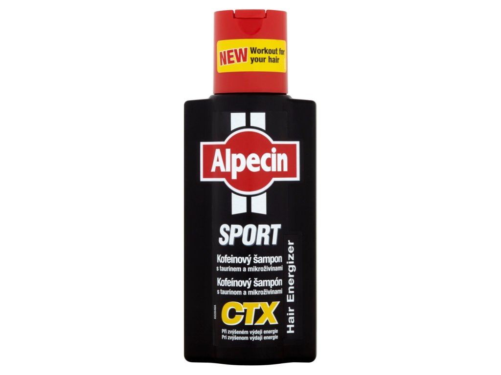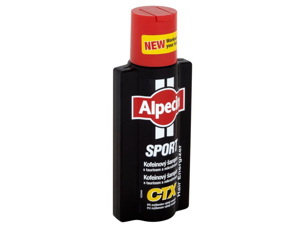 Alpecin Sport Kofeinový šampon CTX - trénink pro vaše vlasy. Vlasový šampon je vhodný pro muže, u kterých hrozí vypadávání vlasů a nedostatek energie pro růst vlasů z důvodu tělesné námahy. Energetická vzpruha pro vlasy díky Kofeinu, taurinu a mikroživinám. Pro posílení růstu vlasů, pro husté a silné vlasy. Množství absorbovaného Kofeinu závisí na délce působení. Kofeinový komplex Alpecinu je ve vlasovém kořínku velmi dobře prokazatelný již za 2 minuty.