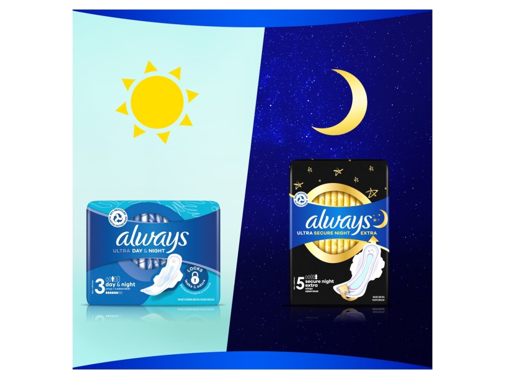 Dámské hygienické vložky Always Ultra Night nabízí diskrétní a maximálně spolehlivou ochranu před protečením. Jsou uzpůsobeny speciálně pro použití na noc tak, že ochranu poskytují po delší dobu.