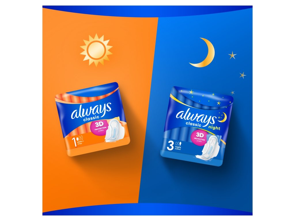S hygienickými vložkami Always Classic Night můžete odpočívat v klidu. Hygienické vložky Always Classic Night jsou určeny na noc nebo při velmi silné menstruaci, nabízejí vynikající ochranu (v porovnání s vložkami Always Classic Normal a Long).