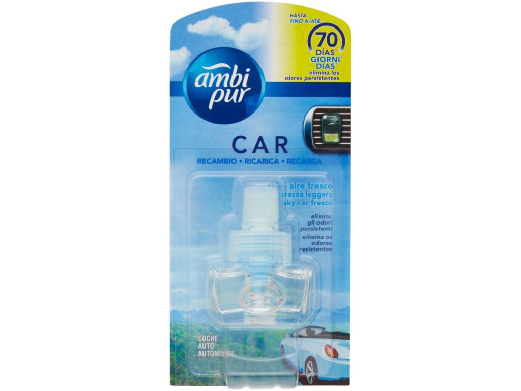 Osvěžovač vzduchu do auta Ambi Pur Car je elegantní pomocník, který se připevní ke klimatizaci vašeho auta a díky nové a jedinečné technologii Odourclear osvěží vaše auto a zbaví jej i těch nejvytrvalejších pachů, jako jsou potraviny, domácí zvířata, kouř nebo odpadky. Na tomto stylovém osvěžovači vzduchu si sami nastavíte intenzitu vůně podle svého přání a pak už se můžete jen pohodlně usadit a užívat si svěží vůni Ambi Pur, kdekoliv a kdykoliv pojedete. Každá náplň vydrží až 70 dnů (při nastavení na nízkou intenzitu a při průměrných podmínkách řízení), a tak můžete spokojeně dýchat vy i vaše posádka.