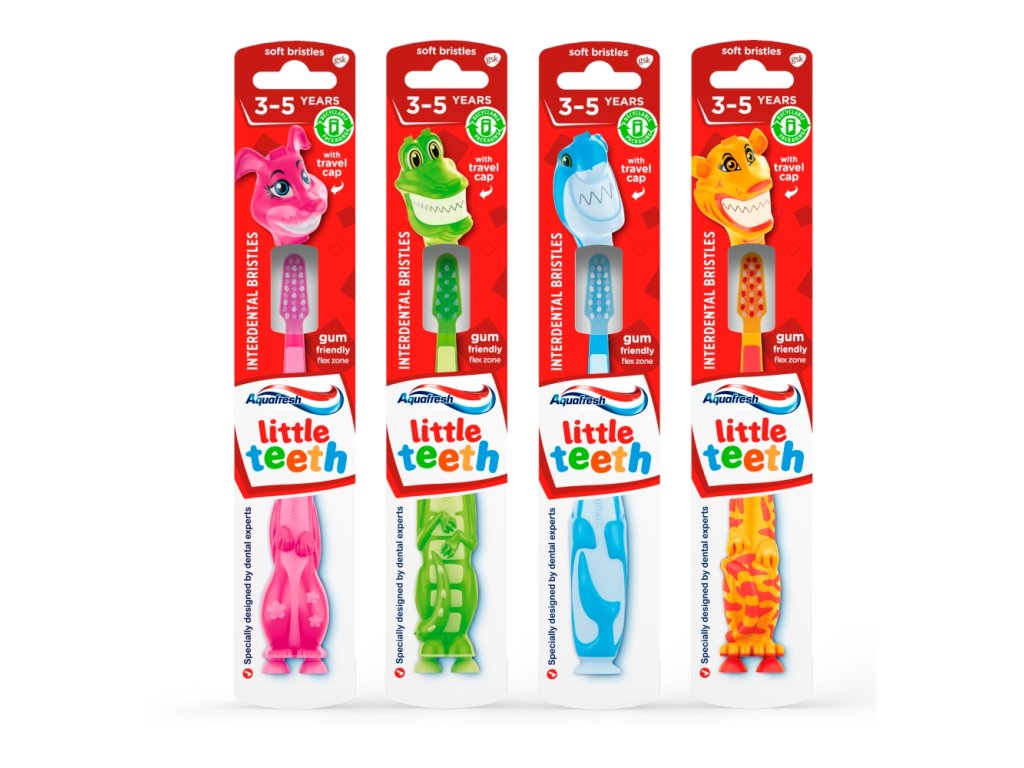 Zubní kartáček Aquafresh Little Teeth Soft je kartáček pro děti s jemnými vlákny. Zubní kartáček chrání mléčné zuby a brání tvorbě zubního kazu. Dodávka je závislá na aktuální nabídce a není možné doručit konkrétní motiv. Charakteristika Aquafresh Little Teeth Soft dětský zubní kartáček: Je určený dětem ve věku 3-5 let. Má jemné štětiny, které odstraňují zbytky jídla i zubní plak. Jeho pružný krček nevyvíjí tlak na dětské dásně. Tyto jsou tak chráněné před podrážděním či mechanickým poškozením. Doporučuje se, aby se zubní kartáček měnil po třech měsících. Použití Aquafresh Little Teeth zubní kartáček: Přílišné/nadměrné ohýbání krčku kartáčku může způsobit jeho zlomení. Děti do 6 let by si měly čistit zuby pod dohledem dospělé osoby. Nenechávejte děti žvýkat štětiny ani kartáček. Nevkládejte krytku kartáčku do úst. Je doporučeno měnit zubní kartáček každé 3 měsíce.