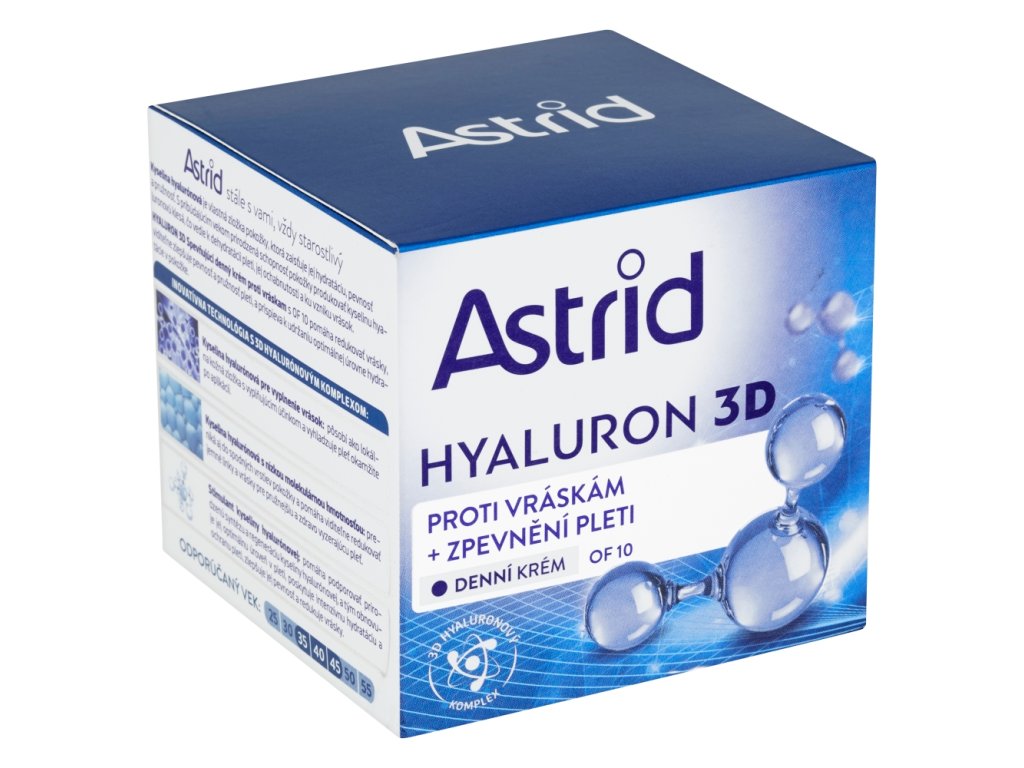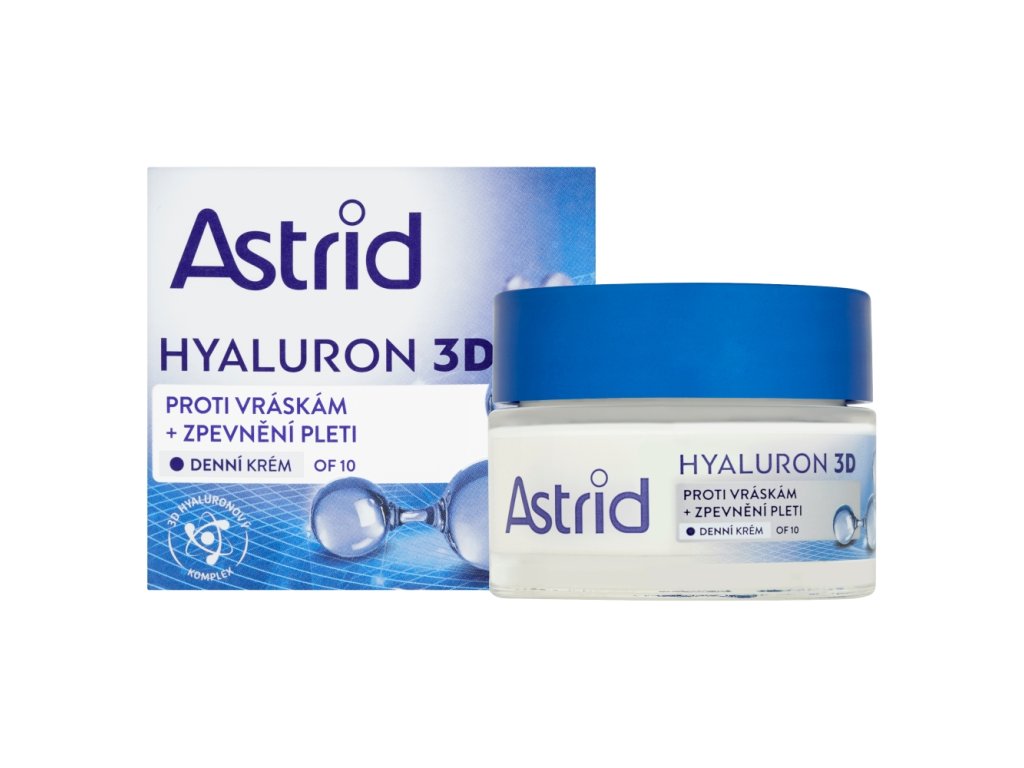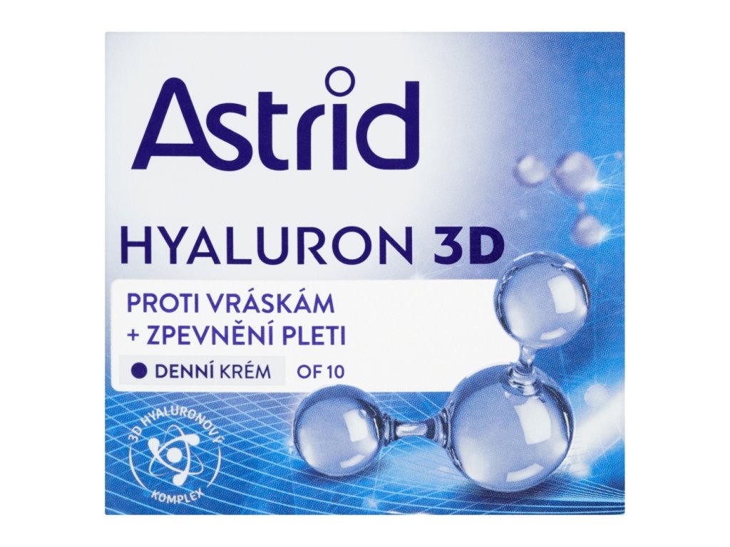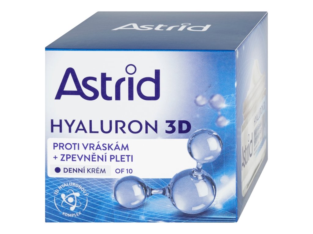 Zpevňující denní krém Astrid Hyaluron 3D pomáhá redukovat vrásky, zlepšuje pevnost a pružnost pleti. Pomáhá redukovat hloubku a délku vrásek - po aplikaci vyhlazuje vrchní vrstvu pokožky a ve spodních vrstvách pak napomáhá zlepšit její elasticitu a pevnost. Navíc přispívá k optimální hydrataci pokožky a zanechává jí sametově jemnou a pružnou. UVA a UVB filtry s OF 10 chrání pleť před slunečním zářením a předčasným stárnutím.