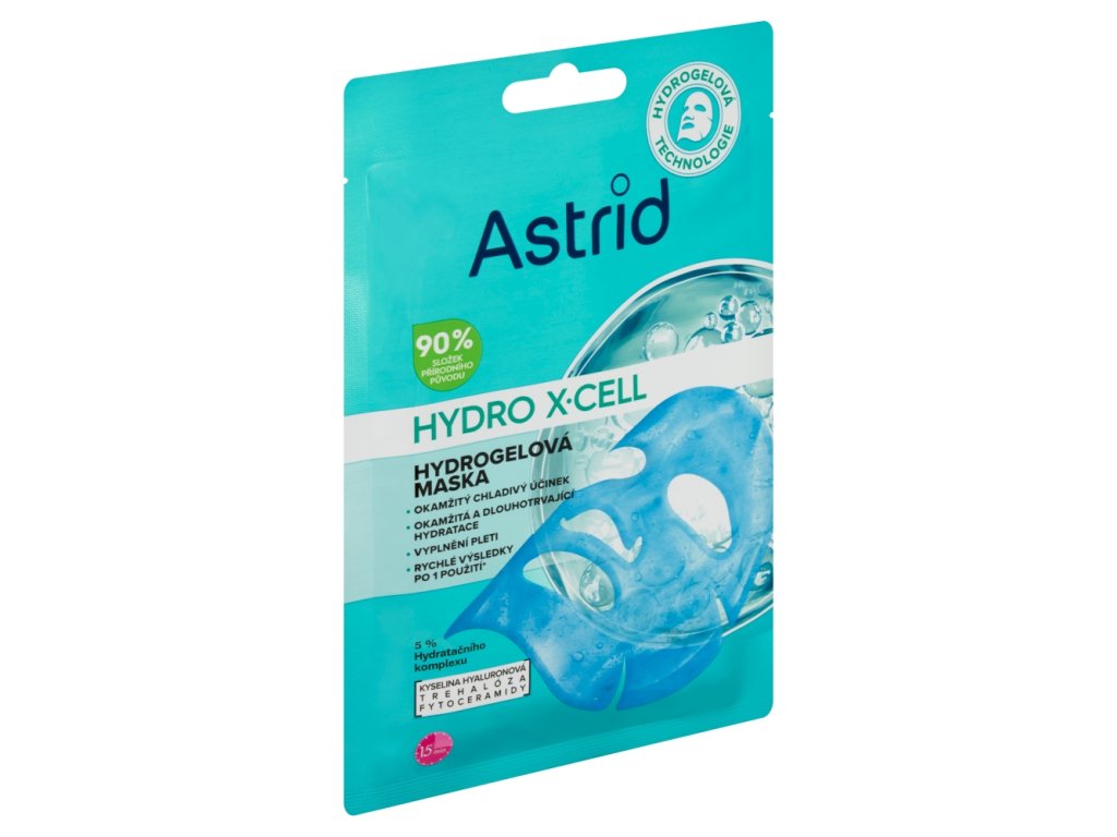 Astrid Hydro X-Cell hydrogelová maska s 90 % složek přírodního původu je obohacena o 5 % účinného multiaktivního hydratačního komplexu s kyselinou hyaluronovou, trehalózou (zadržující vlhkost) a fytoceramidy. Přináší pocit okamžité hydratace a uzamyká vlhkost pro dlouhotrvající výsledky. Hydrogelová technologie dodává pleti okamžitý chladivý efekt a napomáhá lepšímu vstřebávání aktivních složek. Vhodné pro všechny typy pleti.