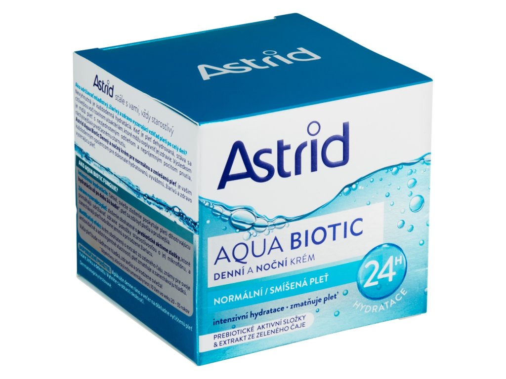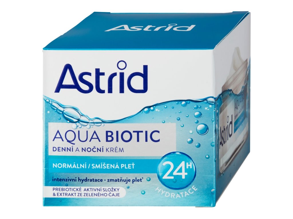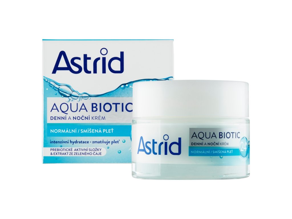 Astrid Aqua Biotic je denní a noční hydratační krém, který poskytuje pleti intenzivní hydrataci až po dobu 24 hodin a zároveň ji zmatňuje. Lehké, svěží složení obohacené o vitaminový komplex chrání pleť před nepříznivými vlivy vnějšího prostředí a pomáhá zlepšit její elasticitu. Vysoce účinný hydratační komplex HYDROVITON Plus přispívá k udržení optimální hladiny hydratace v pleti a zanechává ji sametově jemnou a pružnou. Vaše pleť bude nádherně hladká, zdravější a přirozeně svěží! Dermatologicky testováno.