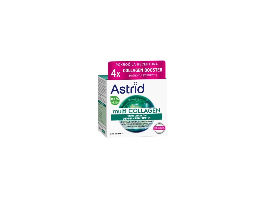 Astrid Multicollagen denní krém proti vráskám SPF 10 posiluje přirozenou tvorbu kolagenu, vyhlazuje vrásky a chrání pleť před slunečním zářením, čímž zajišťuje mladší a pevnější vzhled.Doplňkové parametry