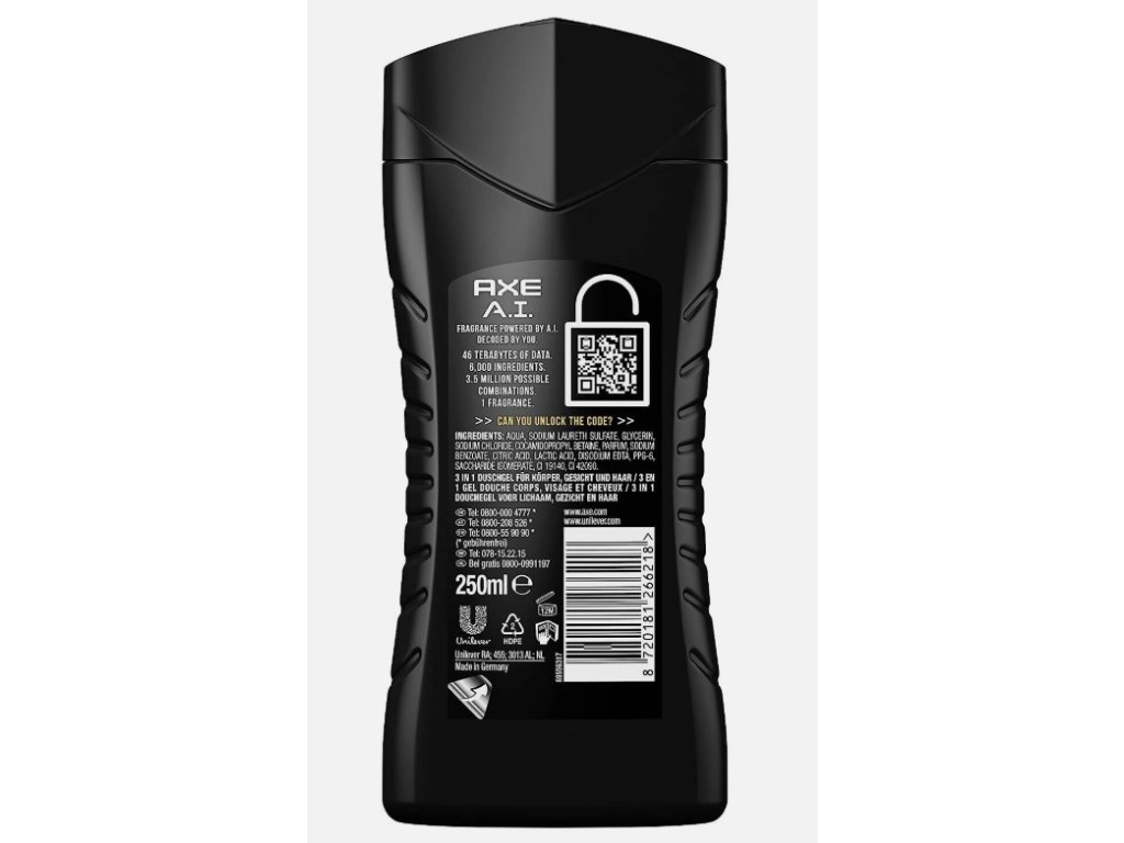 AXE AI Limited Edition je energizující sprchový gel pro muže o objemu 250 ml, který je navržen tak, aby probudil tělo i mysl během sprchování. Gel účinně čistí pokožku, odstraňuje nečistoty a zároveň pomáhá zanechat svěží a energický pocit po každém použití. Vůně sprchového gelu je obvykle mužná, svěží a dynamická, což přispívá k pocitu aktivace a sebevědomí, ideální pro každodenní použití i po sportovní aktivitě. Produkt je balen v praktickém tubovém balení, které je pohodlné pro použití doma i na cestách.