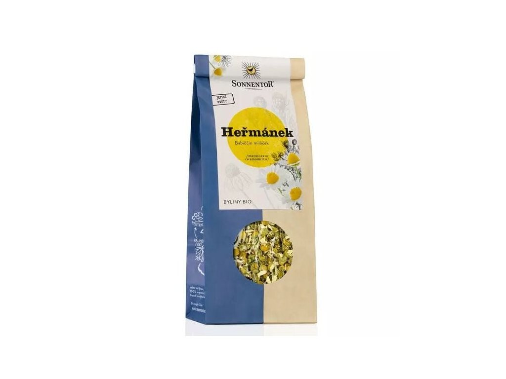 BIO Heřmánek je sušená forma květů heřmánku pravého (Matricaria), který patří mezi oblíbené bylinky lidí na celém světě. Jedná se o čaj z vysoce kvalitních květů heřmánku s podmanivou vůní a květinovou chutí. Je rozšířen zejména v jižní Evropě nebo ve Středomoří, ale hojně se vyskytuje i na Slovensku a v České republice. Často bývá označován za krále bylinek. Lze si ji vychutnat kdykoli během dne, kdy vám zpříjemní chvíle pohody při vašich oblíbených činnostech. Spolehlivě vás připraví na večerní spánek a skvěle chutná v dobré společnosti vaší rodiny či přáteli.