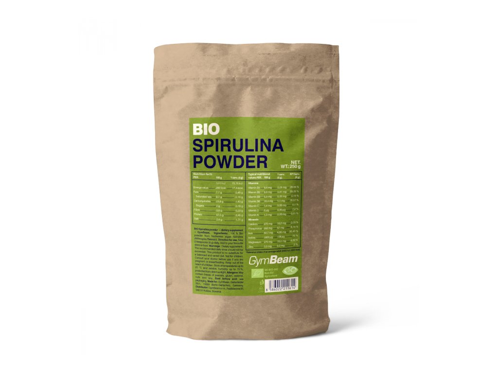 BIO Spirulina prášek pochází ze zelenomodré řasy spiruliny, která díky svému bohatému obsahu živin a bioaktivních látek patří mezi superpotraviny. Udělá na vás dojem nejen značným podílem vitamínů a minerálních látek, ale také vysokým obsahem bílkovin. Ty podporují růst a udržení svalové hmoty či udržení normálního stavu kostí. Prášek je navíc zdrojem vlákniny a neobsahuje přidaný cukr.