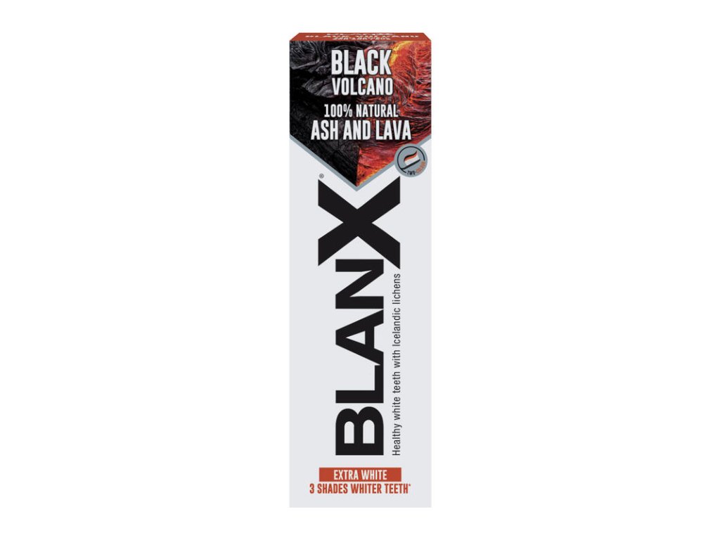 Bělící účinek Blanx Black Volcano je nová zubní pasta Blanx na bázi 100% přírodních islandských lišejníků, popela a lávy, která poskytuje až o 3 odstíny bělejší zuby. Díky čisticím a absorpčním vlastnostem 100% přírodního popela, lávy a dřevěného uhlí působí Blanx Black Volcano bělícím účinkem bez abrazivního poškození. Složení doplňují 100% přírodní islandské lišejníky, měkký oxid křemičitý a fluoridové soli s antibakteriálním a hloubkovým čisticím účinkem. Výbušná chuť pro dlouhotrvající svěžest.Doplňkové parametry