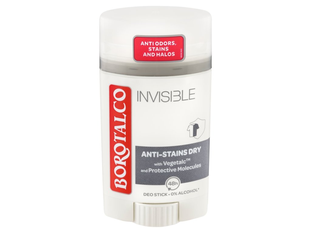 Borotalco Invisible byl vyvinut speciálně za účelem redukce vzniku žlutých skvrn na světlých látkách a bílých stop na tmavých látkách. Díky svému složení s obsahem Microtalca, pohlcujícím pot, reguluje deodorant pocení a denně zajišťuje suchou pokožku.Invisible Stick neobsahuje ŽÁDNÉ hliníkové soli.