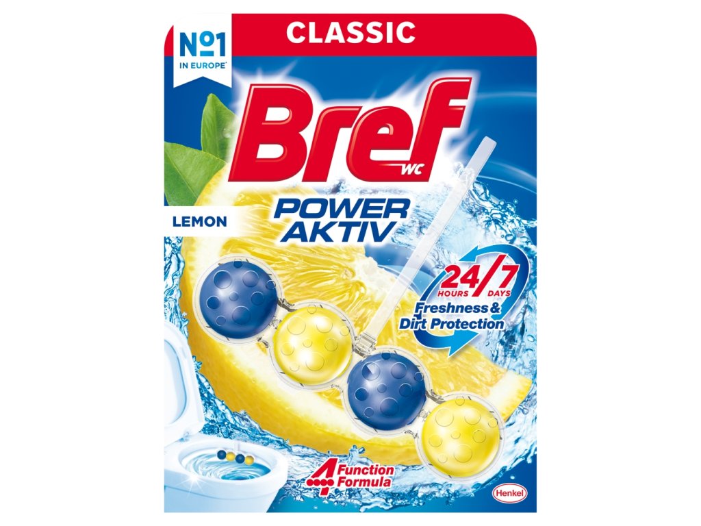 Hledáte jednodušší způsob, jak udržet vaši toaletu čistou a svěží? Bref WC blok je jednoduchým a pohodlným způsobem, který zajišťuje čistotu a svěžest ve vaší toaletě od prvního do posledního spláchnutí. Bref Power Aktiv WC blok s o + 50 % vyšším účinkem proti vodnímu kameni má složení se 4 funkcemi: