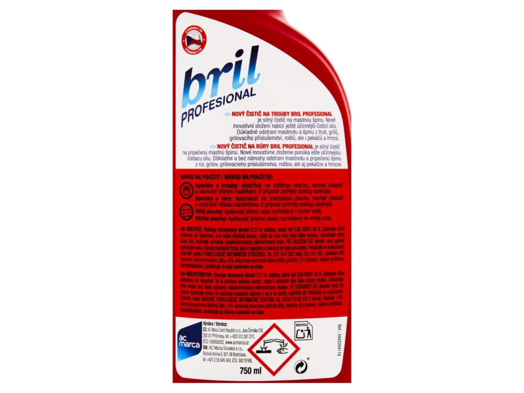 Bril PROFESIONAL Čistič na trouby je extra silný čistič na připečenou mastnou špínu. Nové inovativní složení nabízí ještě účinnější čistící sílu. Důkladně a bez námahy odstraní mastnotu apřipečenou špínu ztrub, grilů, grilovacího příslušenství, roštů, ale i pekáčů a hrnců. Bril čistič na trouby jeextra silný čistič napřipečenou mastnou špínu. Nové inovativní složení nabízí ještě účinnější čistící sílu. Důkladně a bez námahy odstraní mastnotu a připečenou špínu z trub, grilů, grilovacího příslušenství, roštů, ale i pekáčů a hrnců.