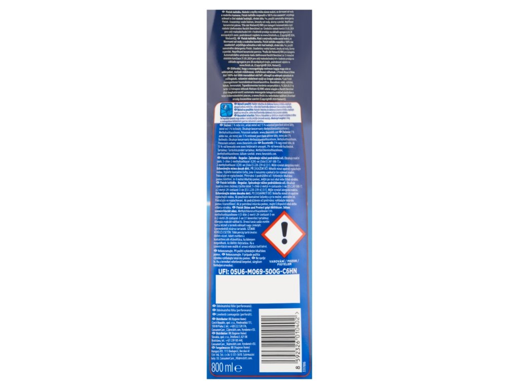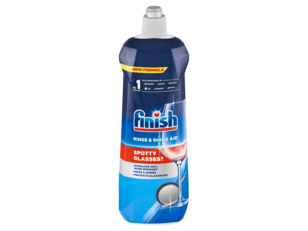 Finish na sklo a nádobí beze skvrn, které září diamantovým leskem. Dokonale odstraňuje vodní rezidua (kapky vody), zanechává diamatový lesk, účinkuje po dobu cyklu oplachování, odstraňuje jak mycí prostředek tak zbytky jídla z nádobí. Urychluje schnutí nádobí, zajišťuje důkladné opláchnutí a potěší vás i svěží vůní.