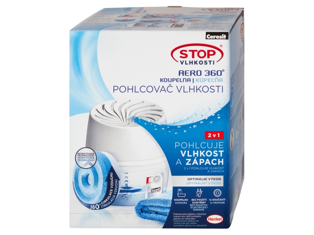 Pohlcovač vlhkosti Ceresit Stop Aero 360° pomáhá optimalizovat nadměrnou vlhkost vzduchu a neutralizovat pachy prostřednictvím proudění vzduchu.Zařízení má aerodynamický tvar a jedinečný větrací otvor, kterým proudí vzduch k tabletě. Je určen především pro použití v prostoru koupelny do 10 m2. Právě v koupelně, která má často omezené možnosti větrání, je boj s nežádoucí vlhkostí často marný, což má za následek plísně, zatuchlé ručníky a nepříjemný vzduch.