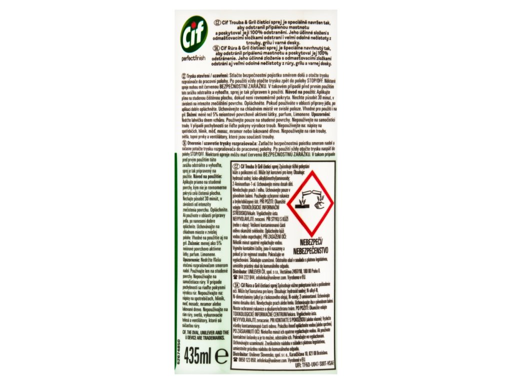 | Bezpečnostní upozornění: | NEBEZPEČÍ. Upozornění: Nedržte lahvičku dnem vzhůru. Používejte pouze na studené povrchy. Nepoužívejte na samočistící trouby. V případě pochybností se řiďte pokyny výrobce troub. Nepoužívejte na: nápisy na spotřebičích, hliník, měď, mosaz, mramor nebo lakované dřevo. Nepoužívejte na rám trouby, světla, topné prvky a ventilátory, které jsou součástí trouby. Cif Trouba & Gril čisticí sprej Způsobuje těžké poleptání kůže a poškození očí. Může být korozivní pro kovy. Obsahuje: hydroxid sodný; koko-alkyl(dimethyl)aminoxidy 2-Aminoethan-1-ol. Uchovávejte mimo dosah dětí. Nevdechujte prach/mlhu. Uchovávejte pouze v původním balení. Používejte ochranné rukavice a brýle/obličejový štít. PŘI POŽITÍ: Okamžitě volejte TOXIKOLOGICKÉ INFORMAČNÍ STŘEDISKO/lékaře. Vypláchněte ústa. NEVYVOLÁVEJTE zvracení. PŘI STYKU S KŮŽÍ (nebo s vlasy): Veškeré kontaminované části oděvu okamžitě svlékněte. Opláchněte kůži vodou (nebo osprchujte). PŘI ZASAŽENÍ OČÍ: Několik minut opatrně vyplachujte vodou. Vyjměte kontaktní čočky, jsou-li nasazeny a pokud je lze vyjmout snadno. Pokračujte ve vyplachování. Skladujte uzamčené. |
