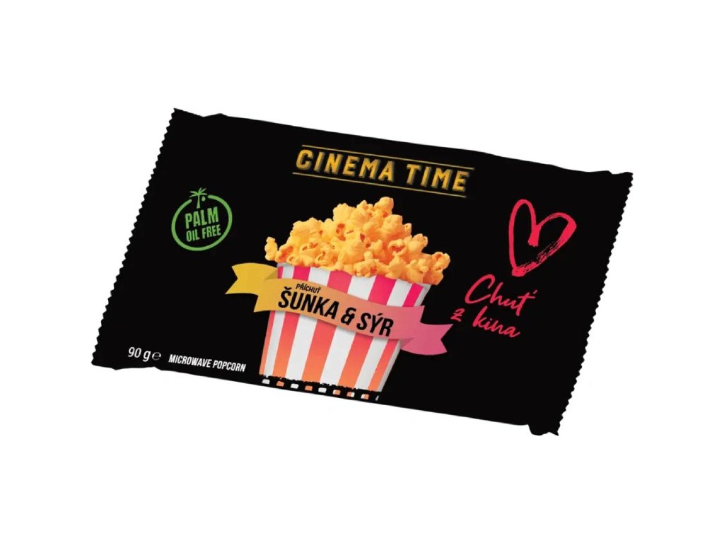 Dopřejte si chuťové kino u vás doma. Cinema Time Premium Šunka & Sýr 90 g spojuje bohatou sýrovou notu s pikantním akcentem šunky. Kvalitní kukuřičná zrna se při přípravě krásně rozvinou do lehkých, křupavých vloček – bez složité kuchařiny: stačí pár minut v mikrovlnce a je hotovo. Skvělé pro rychlé pohoštění i večerní mlsání.