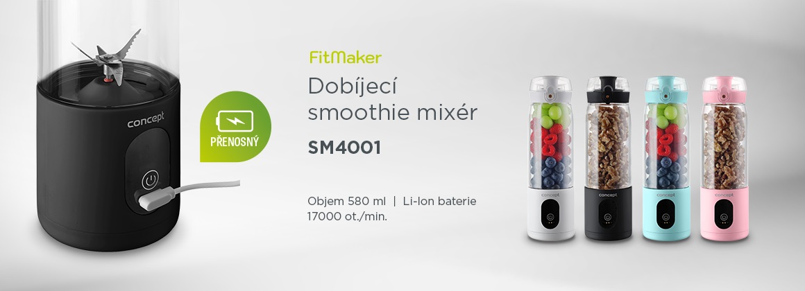 S kompaktním mixérem Concept SM4001 Smoothie FitMaker si snadno a rychle připravíte své oblíbené smoothie kdykoli a kdekoli budete chtít. Mixér oplývá výkonným motorem generující 17 000 otáček za minutu, díky čemuž šestice nožů důkladně rozmixuje veškeré suroviny. Hlavní výhodou je zabudovaná dobíjecí baterie s vysokou kapacitou a voděodolné provedení IPX7. Proto si můžete snadno vzít mixér Concept s sebou na chatu i výlety a tam si udělat naprosto čerstvé smoothie. Vyjímatelná nádoba má objem 600 ml a je vyrobena z kvalitního plastu bez obsahu BPA, díky čemuž je zdravotně nezávadná. Po ukončení mixování stačí mixér jednoduše propláchnout. Dovnitř nalijte trochu vodu, kapku saponátu a spusťte. Mixér Concept SM4001 Smoothie FitMaker bude zase jako nový. Dobíjecí smoothie má kompaktní rozměry a proto si jej můžete vzít kamkoli s sebou.