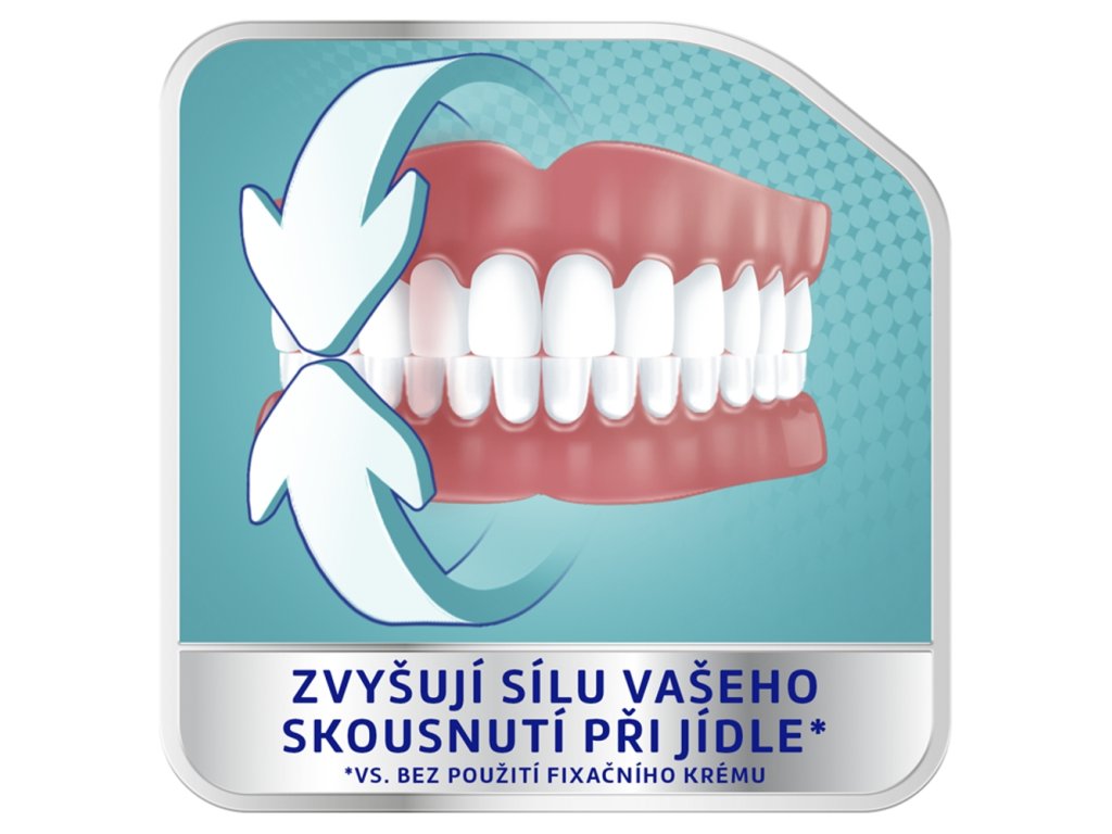 Zabezpečí upevnění Vaší zubní náhrady ve všech směrech: vpředu, vzadu, v horní i dolní části a po celé délce dásní, takže můžete být bez starostí po celý den.
