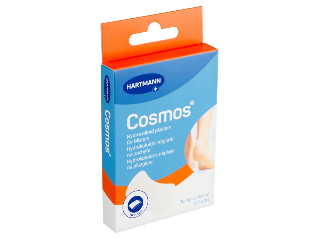 Celohydrokoloidní náplast Cosmos Na puchýře se dvěma vrstvami hydrokoloidů chrání dvojnásobně puchýř před nepříjemným tlakem a třením a účinně tlumí bolest. Léčivý hydrokoloidní polštářek vytváří na puchýři vlhký gel, ve kterém se puchýř rychleji a lépe hojí. Hydrokoloidní vrstva nacházející se na lepicí části náplasti zabraňuje podráždění zdravé pokožky. Náplast dobře drží, je průsvitná a můžete ji nosit i několik dní bez nutnosti výměny.