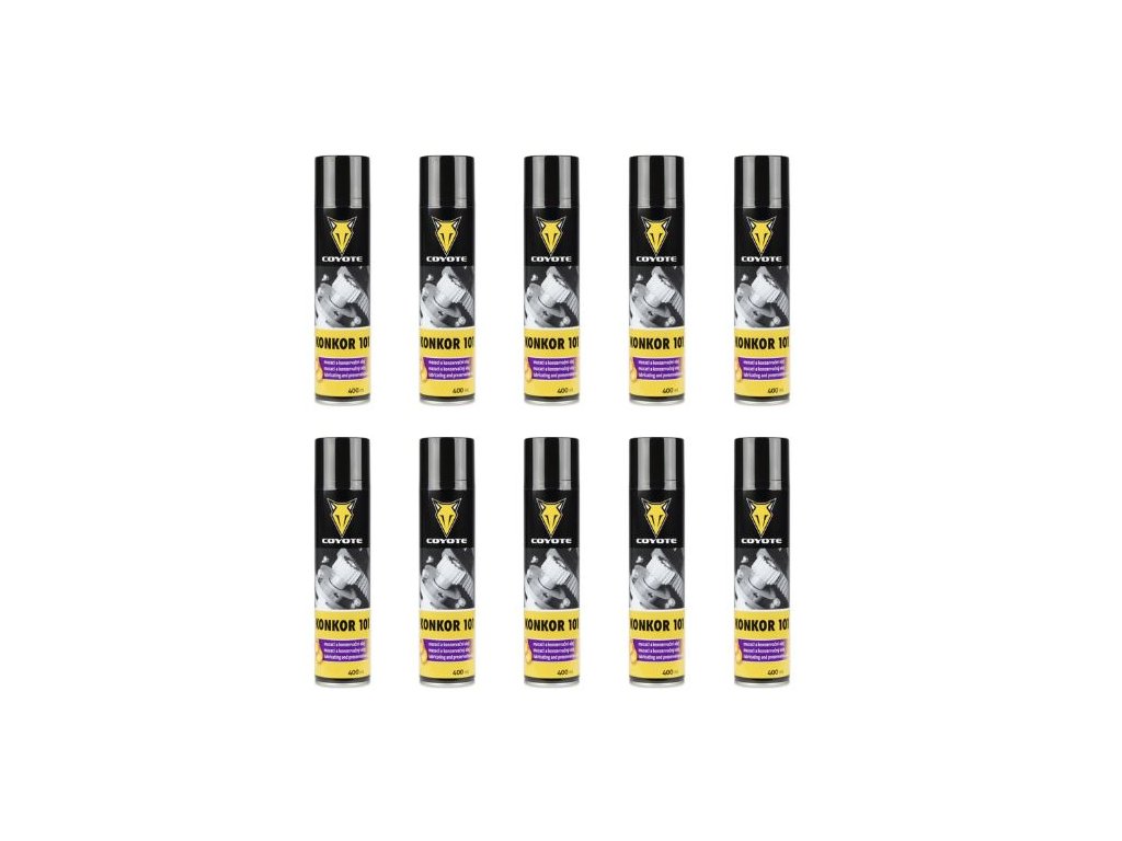 Coyote Konkor 101 je univerzální konzervační a mazací olej ve spreji, který vytváří na povrchu ochranný olejový film. Pomáhá chránit železné i neželezné kovy proti korozi a zároveň zajišťuje jejich promazání. Je vhodný pro použití na stroje, přístroje, motory, panty, kontakty akumulátorů nebo náhradní díly, kde pomáhá uvolňovat zaseklé mechanismy a usnadňuje údržbu.