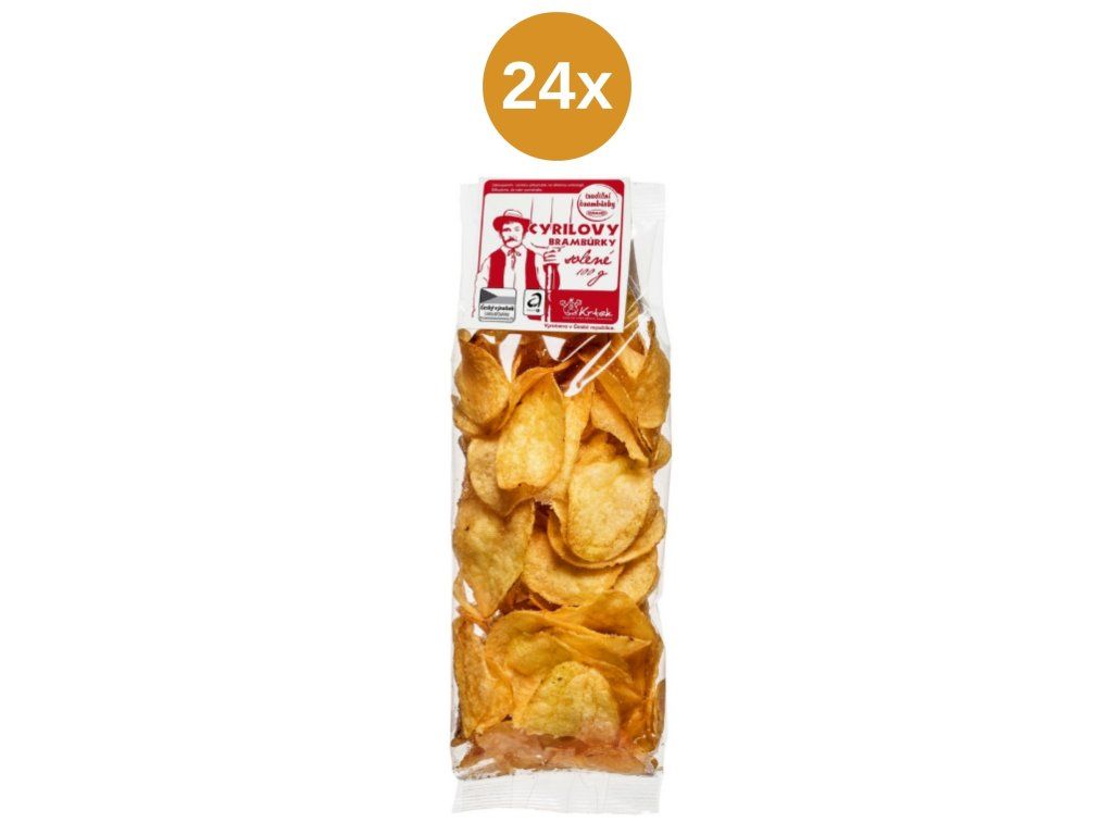 Cyrilovy brambůrky solené jsou klasické smažené bramborové lupínky vyráběné tradiční metodou, které vynikají svou přirozenou chutí a jednoduchým složením. Díky použití kvalitních brambor a 100% řepkového oleje si zachovávají poctivý charakter a výraznou křupavost.