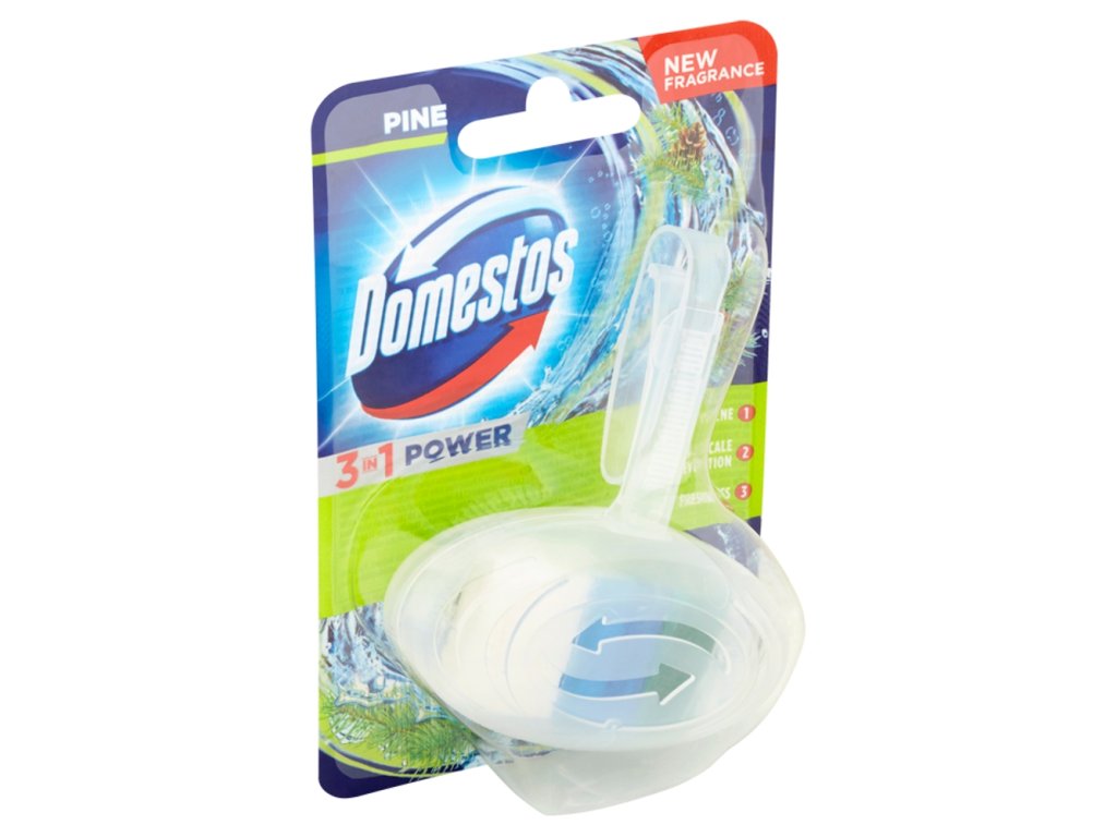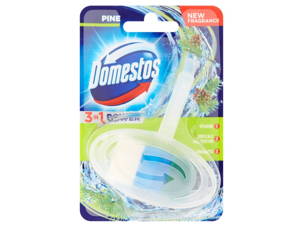 Domestos 3 v 1 tuhé WC bloky jsou složeny ze tří speciálních vrstev a kombinují tak tři účinky. Likvidují prostředí pro množení bakterií. Brání tvorbě vodního kamene. Díky obsahu parfémovaného gelového proužku zanechávají dlouhotrvající svěží vůni po každém spláchnutí.