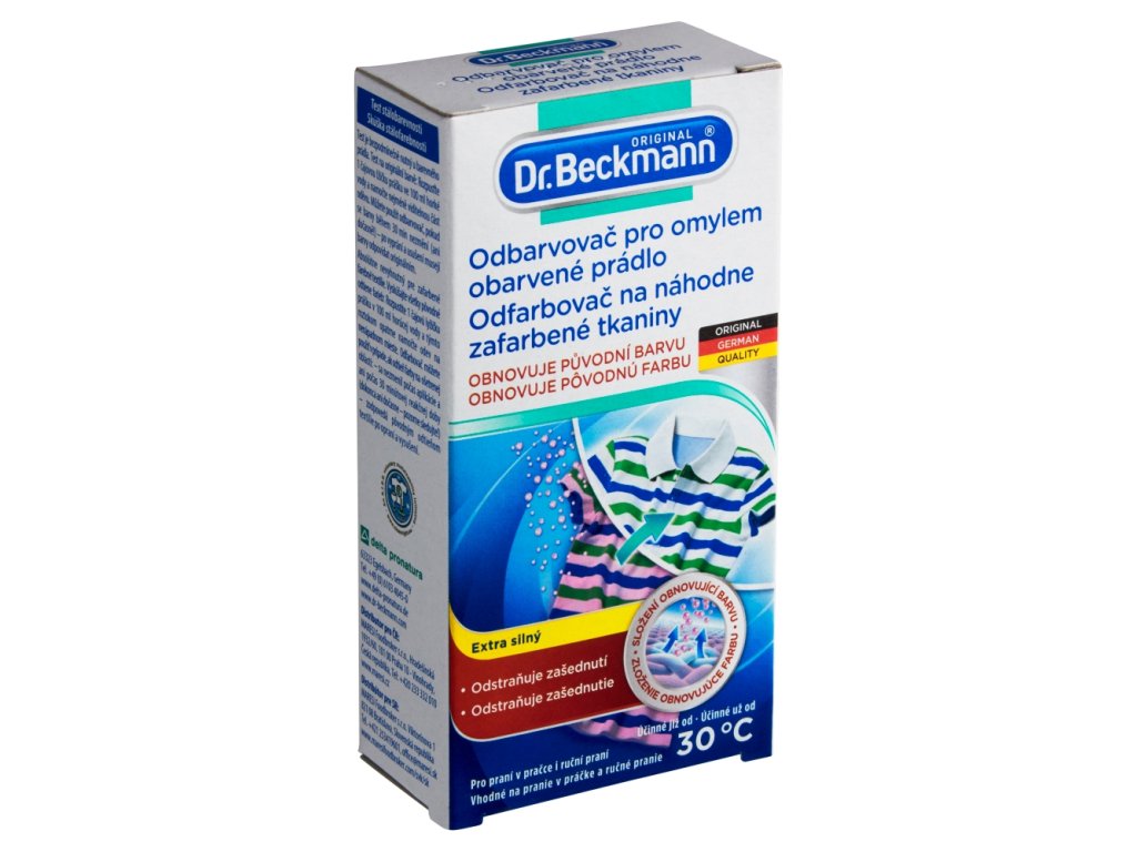 Dr. Beckmann odbarvovač na bílé a stálobarevné oděvy. Bez zápachu a bez chlóru. Lze ho použít na na všechny druhy textilií (ne na syntetické tkaniny a džínovinu). Po použití není třeba oděvy znovu prát. Před použitím je třeba provést zkoušku stálobarevnosti a kontrolu etikety na oděvu. Přípravek také není vhodný na skvrny od opalovacích a samoopalovacích prostředků.