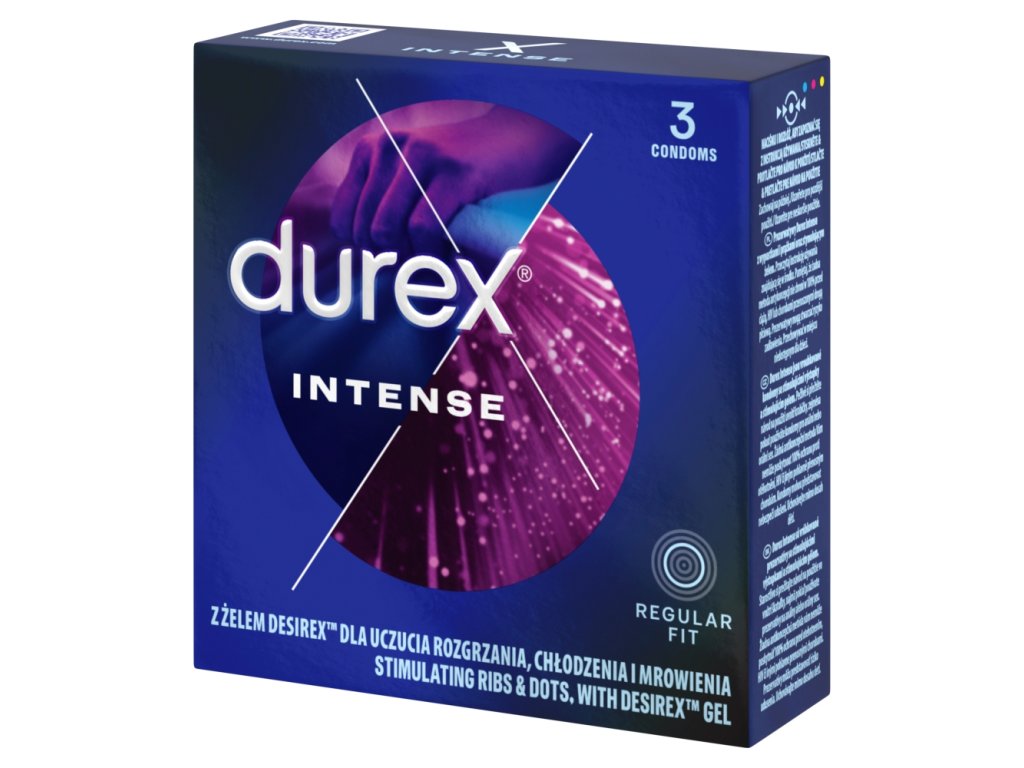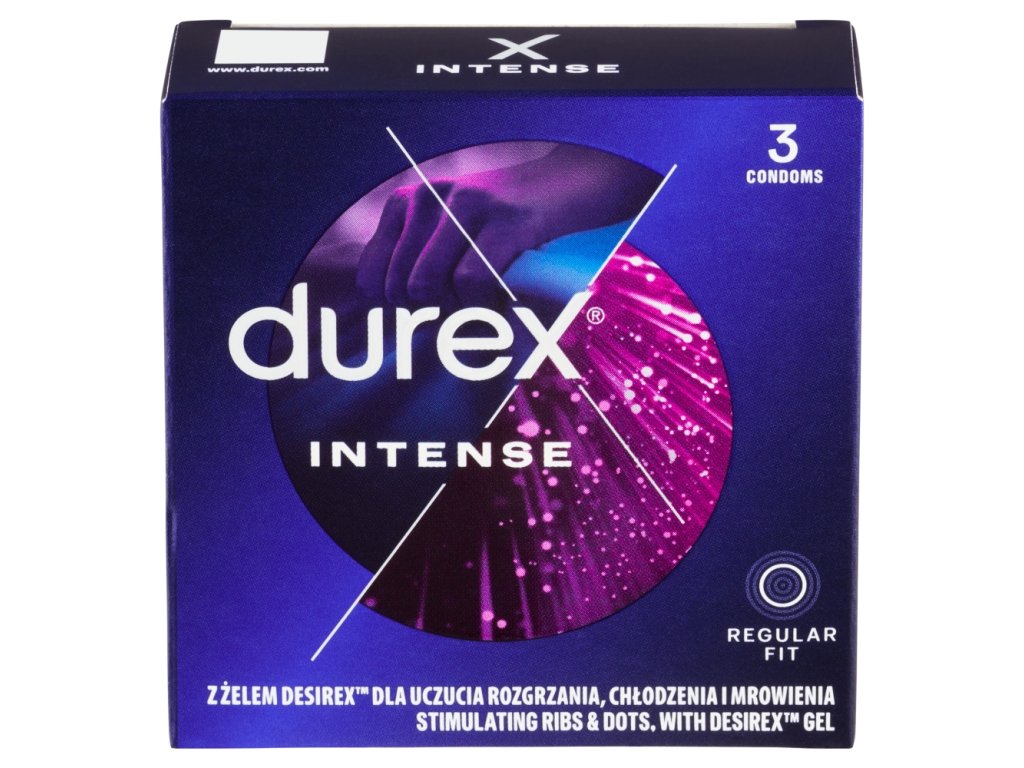 Durex Intense Orgasmic kondomy - stimulační vroubkování a výstupky, s gelem Desirex poskytujícím pocit zahřívání, ochlazení nebo mravenčení.