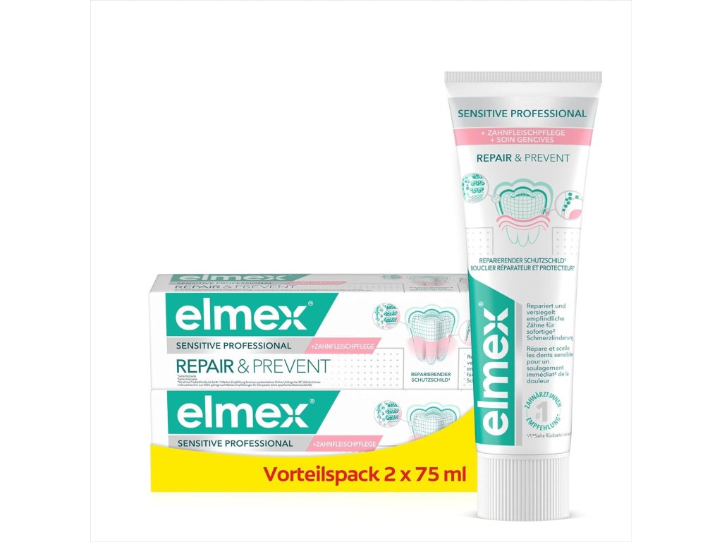 Zubní pasta pro citlivé zuby s exkluzivním a patentovaným složením elmex SENSITIVE PROFESSIONAL Repair & Prevent s PRO-ARGIN technologií. Jedná se o nejnovější pokrok v péči o citlivé zuby. Díky použití této unikátní technologie, kterou používají zubní lékaři při léčbě citlivosti zubů, dochází k uzavírání dentinových tubulů, které vedou k nervovým zakončením, čímž je bolest blokována. Při pravidelném používaní vytváří ochrannou bariéru, která udržuje zubní kanálky uzavřené a chrání před přecitlivělostí.