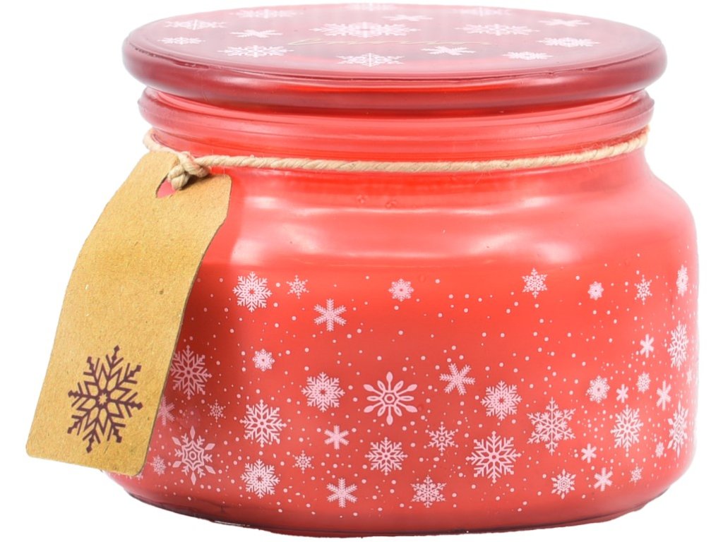 Emocio Vonná svíčka ve skle Magic Snowing 100×79 mm se skleněným víčkem – červeno-bílá