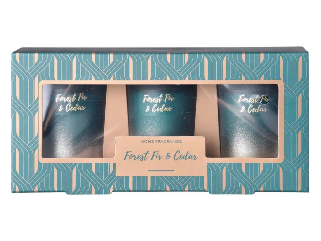 Sada 3 votivních svíček Forest Fir & Cedar přináší lesní a jehličnatou vůni domova. Dárkové balení je praktické a elegantní, vhodné pro vánoční dekorace, zimní aranžmá nebo jako stylový dárek.Doplňkové parametry