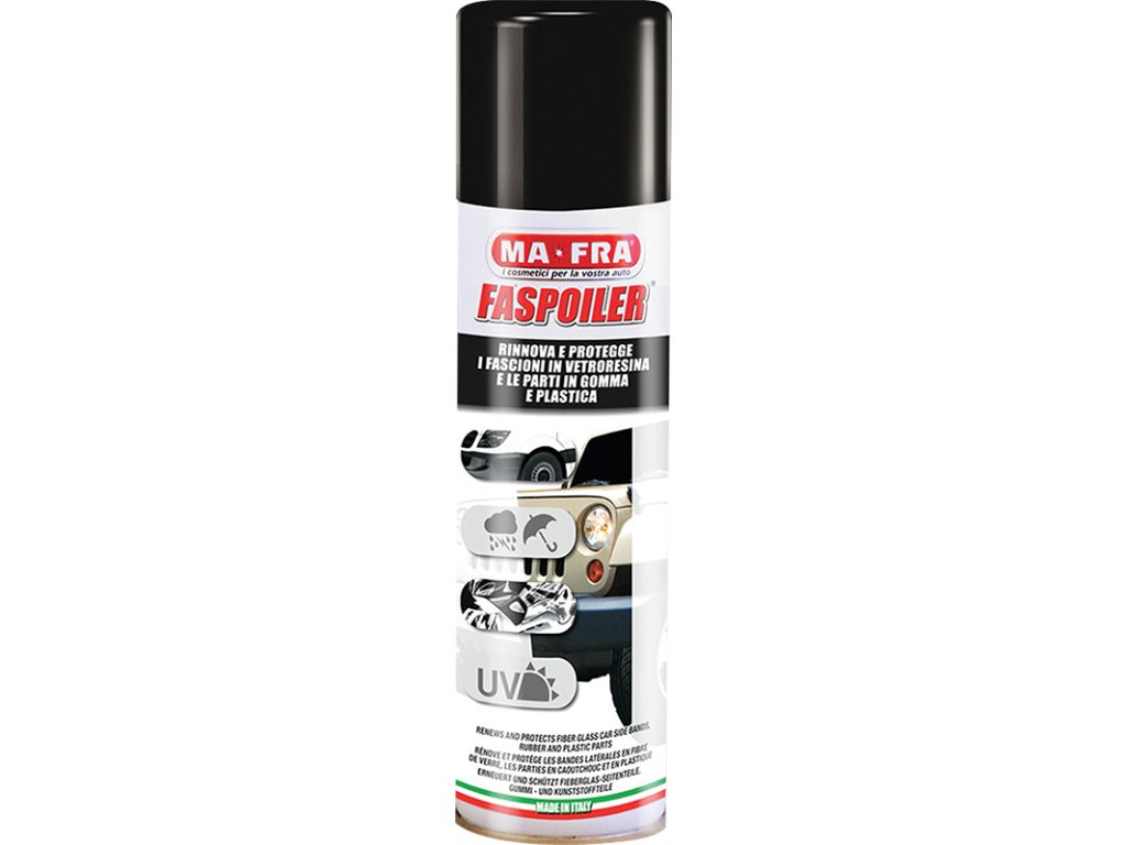 MA-FRA - FASPOILER leští a ochraňuje vnější plasty - sprej - Vytváří ochranný lesklý film s dlouhodobým účinkem. Oživuje barvu a zabraňuje stárnutí plastů.Doplňkové parametry