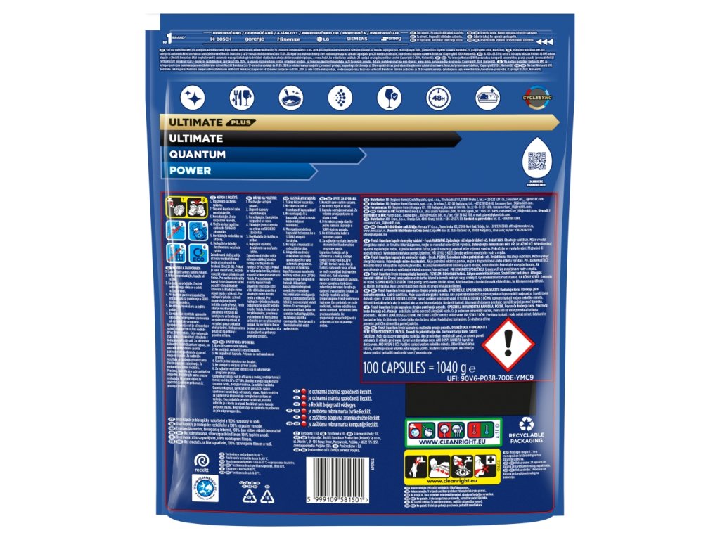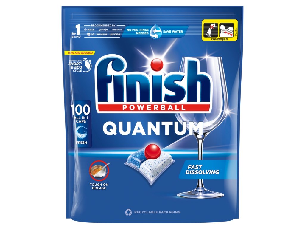 Finish Quantum si poradí se vším, co mu přijde do cesty. Jeho účinné složení s PowerBall zaručuje nejlepší čistotu a lesk pro vaše nádobí a navíc pomáhá chránit proti usazování vodního kamene ve vaší myčce.