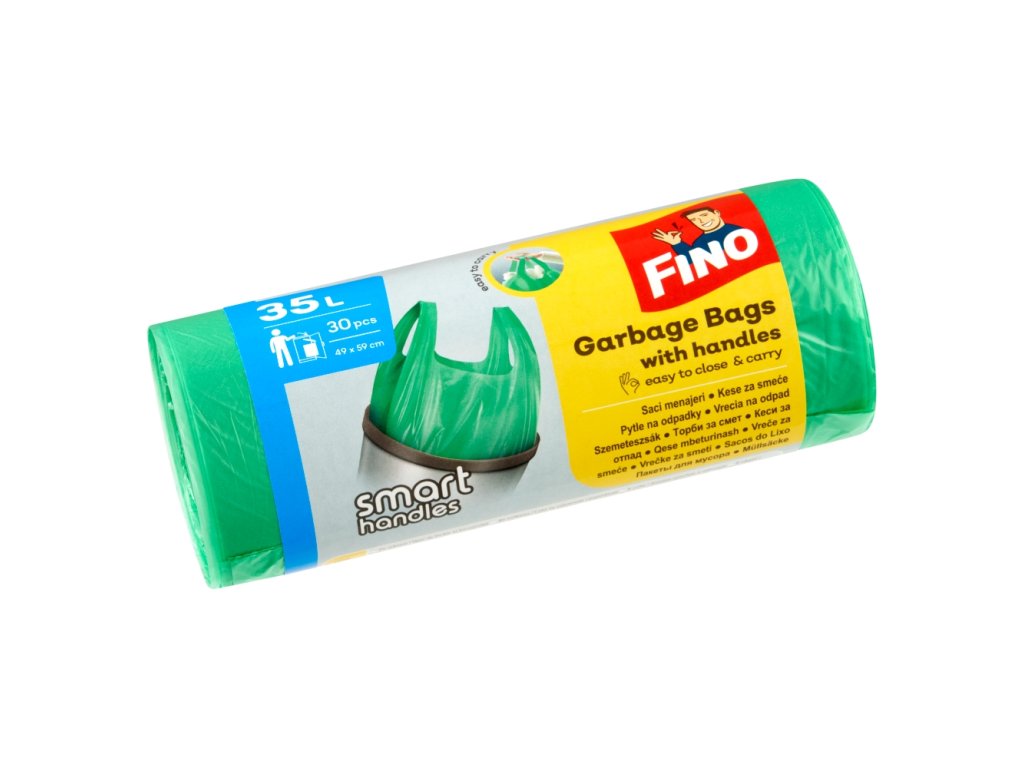 Fino pytle na odpadky s uchy pro snadnou manipulaci o objemu 35 l v balení po 20 kusech, rozměry každého pytle jsou 49 × 60 cm, HDPE, síla pytle 8 mikronů. Pytle můžete používat na odpad nejen ve vaší domácnosti, ale také ve firmách, prodejnách atd.