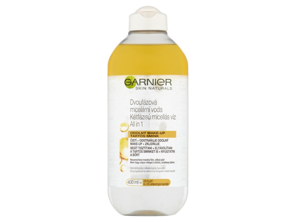 V čem je jiná? Micelární voda Garnier Micellar s olejem má dvoufázové složení, který čistí, zklidňuje a odstraňuje všechny typy make-upu z obličeje, očí a rtů v jednom kroku a bez nutnosti oplachování.