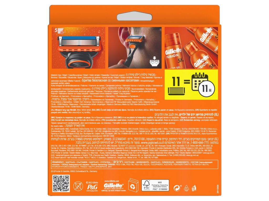 Náhradní holicí hlavice pánského holicího strojku Gillette Fusion5 mají 5 břitů snižujících tření, které umožňují hladké a dlouhotrvající oholení. Břity jsou umístěny blízko u sebe, což zajišťuje úžasný komfort. Na zadní straně holicí hlavice je navíc zarovnávací břit pro těžko přístupná místa a úpravu vousů. Náhradní holicí hlavice Gillette Fusion5 lze použít pro všechny holicí strojky Gillette Fusion5.