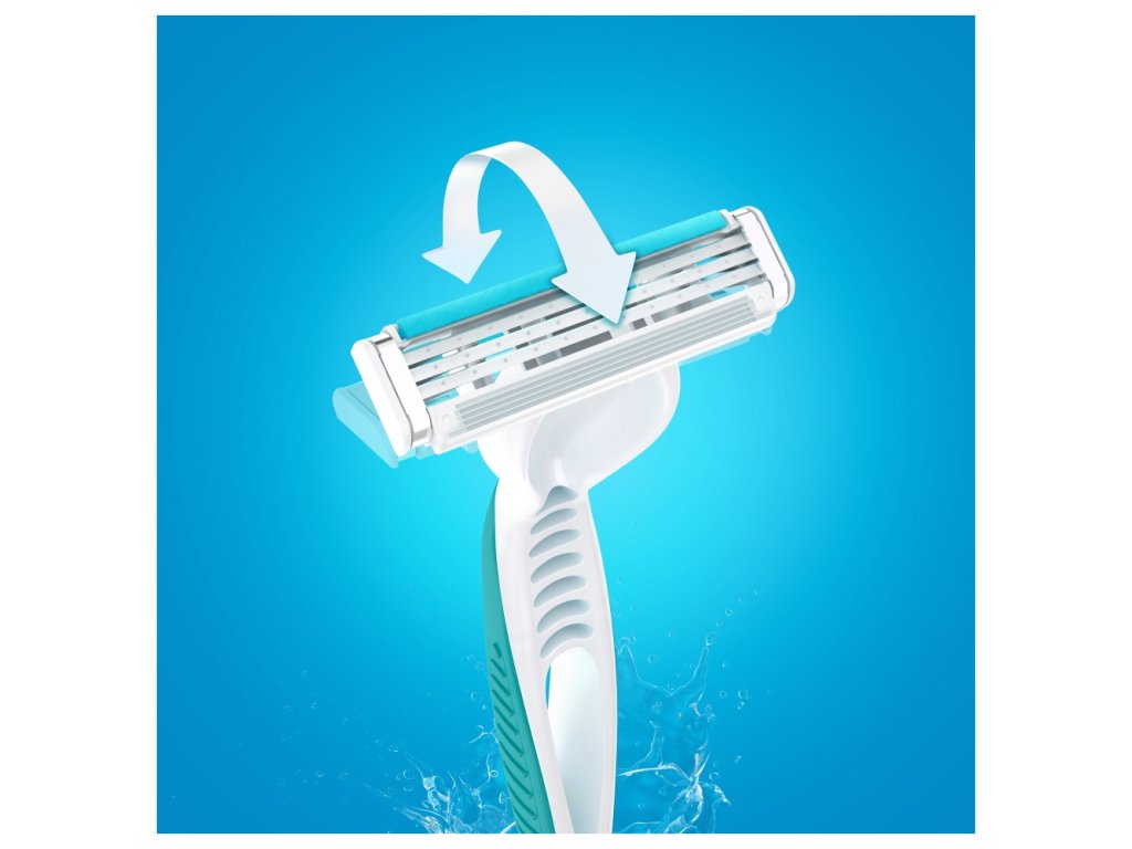 Speciálně navržená rukojeť s výkyvnou hlavou na holení obtížně přístupných míst. Není třeba vyměňovat břity. Po použití prostě vyhodíte.