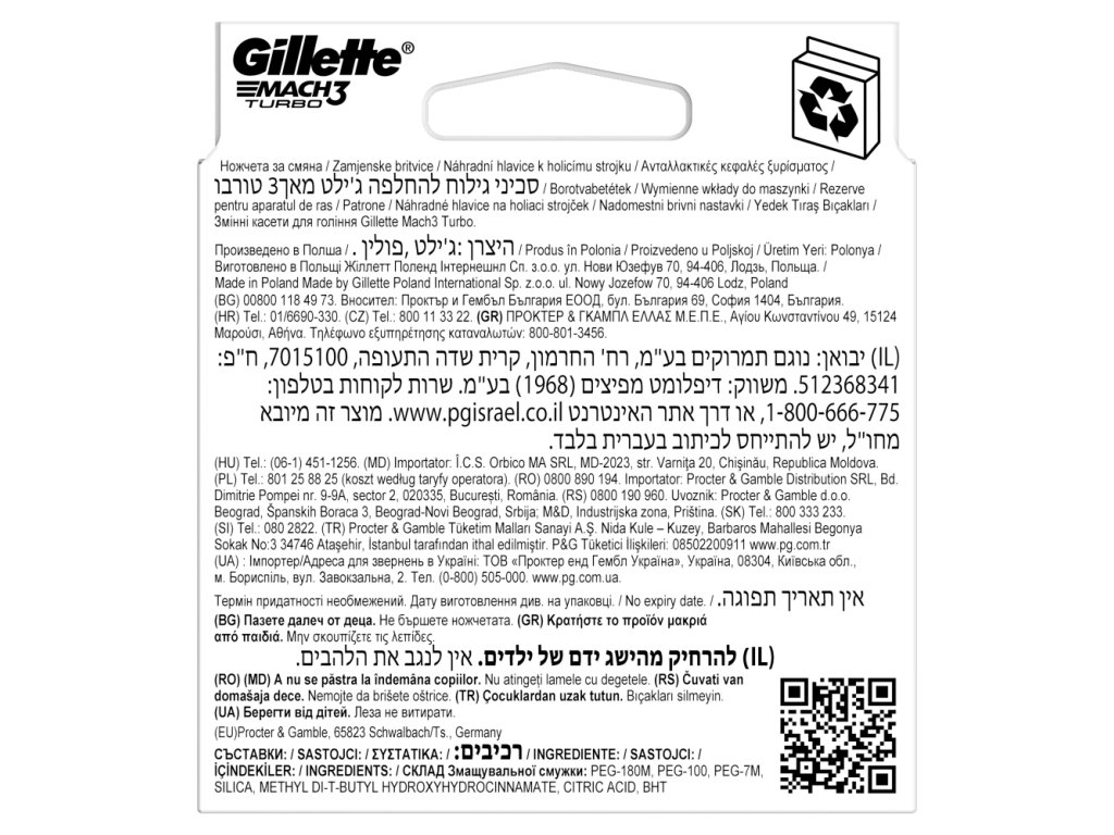 Gillette Mach3 Turbo náhradní hlavice má 3 ošetřující břity, které holí vousy snadněji s menším taháním a vytrháváním (v porovnání s holítkem Blue3). Velký zvlhčující pásek klouže po pokožce a deset ochranných mikrolamel zároveň napíná pokožku a připravuje vousy k hladkému oholení.Vychutnejte si příjemné a dlouhodobé oholení s holicími hlavicemi od značky Gillette Mach3 Turbo - 1 hlavice vystačí až na 15 precizních oholení!