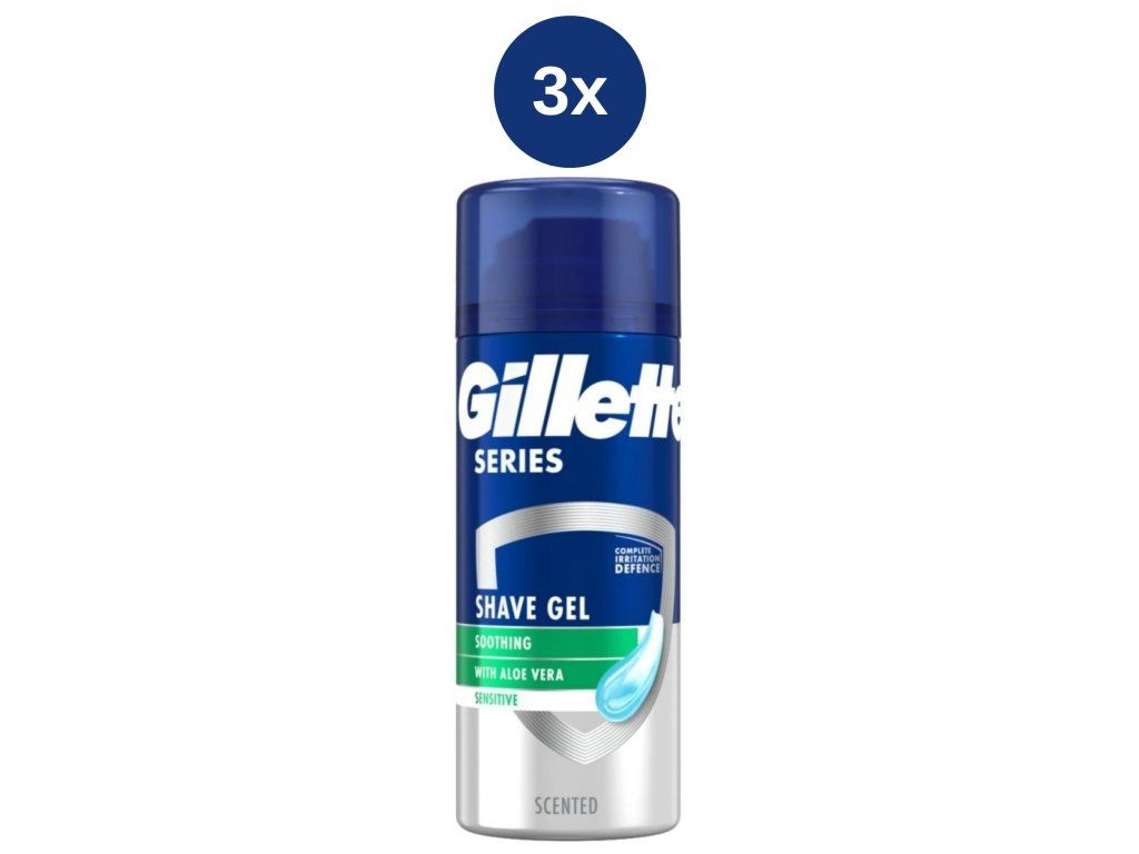Gel na holení zajišťuje lepší ochranu proti drobným poraněním, zarudnutím a napjatostí pokožky. Gillette Series Sensitive Skin chrání pokožku uklidňujícím dotekem aloe vera. Tři účinné zvlhčující látky zlepšují skluz holicího strojku.