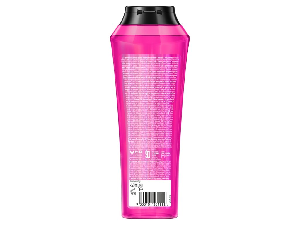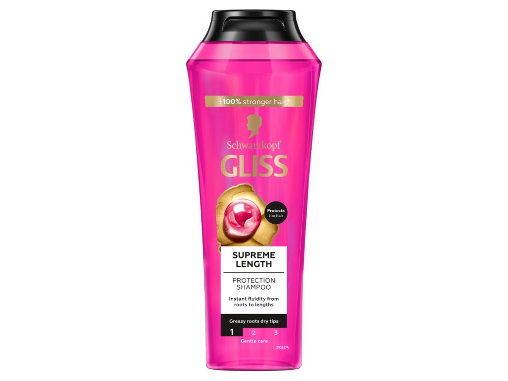 Receptura Gliss Kur s keratin sérem regeneruje již vzniklá poškození, posiluje buněčnou strukturu a tím zabraňuje budoucímu poškození. Pro potřeby dlouhých vlasů náchylných k poškození a mastným kořínkům, šampon Supreme Length s Micro-Repair lipidy a výtažkem z pivoněk odstraňuje přebytečnou mastnotu z kořínků a regeneruje poškozené vlasy po celé jejich délce.