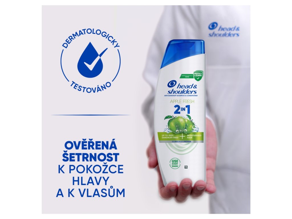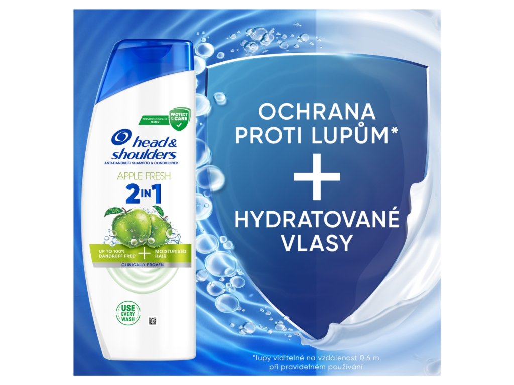 Head&shoulders šampon na vlasy Apple Fresh s jablečnou vůní obsahuje o 25 % více pečujících složek než běžný šampon head&shoulders a zanechává vlasy čisté a hebké. Pomáhá působit i proti odolným lupům. Šampon pro každodenní použití pro muže i ženy se složením Microbiome Balance, které se zaměřuje na hlavní příčinu lupů a udržuje vyvážený mikrobiom pokožky hlavy.