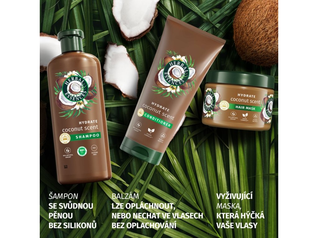 Hydratační kondicionér s kokosovou vůní Herbal Essences coconut scent hydrate pomáhá vyživovat velmi suché vlasy, vam da vnutorny pocit rovnovah a zahltí vaše smysly příjemnou kokosovou vůní. Naše směs rostlinných výživných látek je obohacena o kokosový extrakt, vyznačuje veganským složením bez sulfátů a je určena k hydrataci vysušených vlasů.
