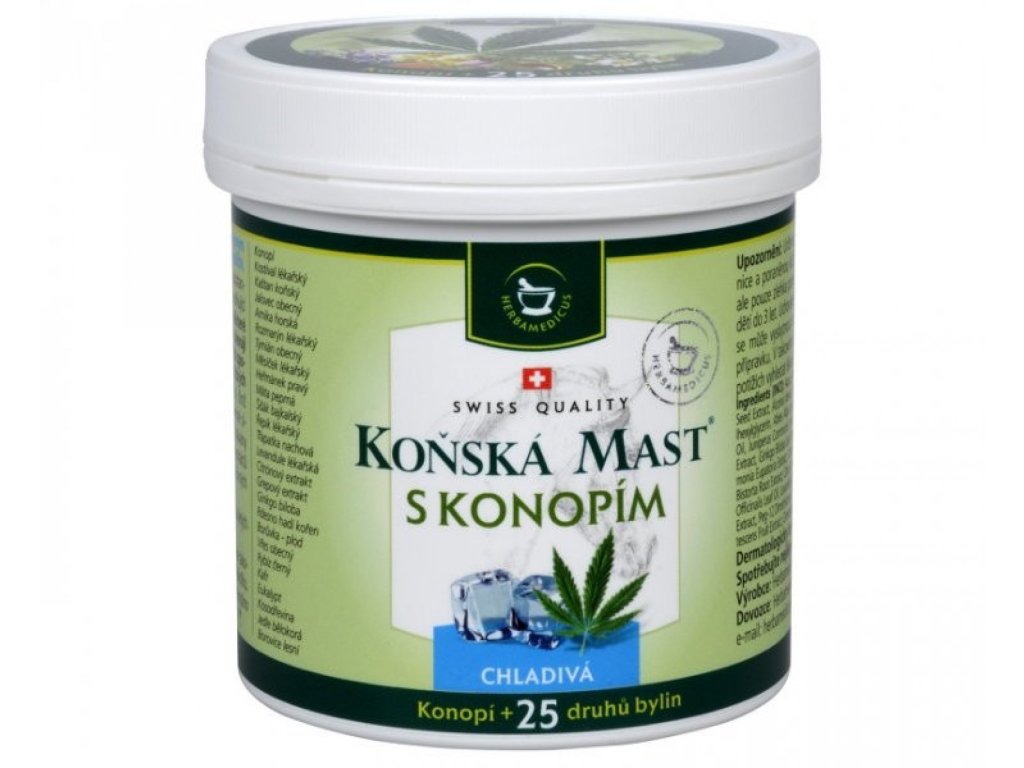 Jedná se o unikátní balzám vyrobený z konopí a 25 bylin. Koňská mast s konopím je vyrobena podle tradiční švýcarské receptury. Její součástí je také plod a květ kaštanu koňského, který je osvědčeným prostředkem v boji proti křečovým žilám.