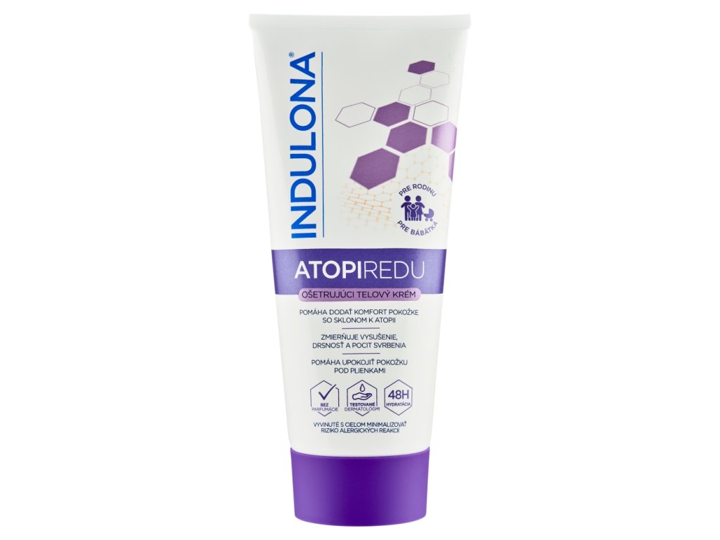 Pečující tělový krém INDULONA ATOPIREDU byl speciálně vyvinutý tak, aby poskytl pokročilou péči projevům extrémně suché pokožky. Vysoce hydratační a zklidňující složení bez parfemace pomáhá poskytnout komfort citlivé pokožce se sklonem k atopii. Okamžitě pomáhá zmírnit vysušení, drsnost a pocit svědění. Se 45 % vazelíny a 3,8 % lanolinu poskytuje pokožce dlouhotrvající ochranu, pomáhá obnovit její ochrannou bariéru, hydratuje a tím napomáhá hojení suché pokožky a zanechává ji hydratovanou po dobu 48 hodin. Vhodný pro každodenní použití. Pro celou rodinu, vhodný pro miminka. Pro všechny typy pokožky. Bez parfemace. Dermatologicky testováno. Testováno pod dohledem pediatra. Vyvinuto s cílem minimalizovat riziko alergických reakcí.