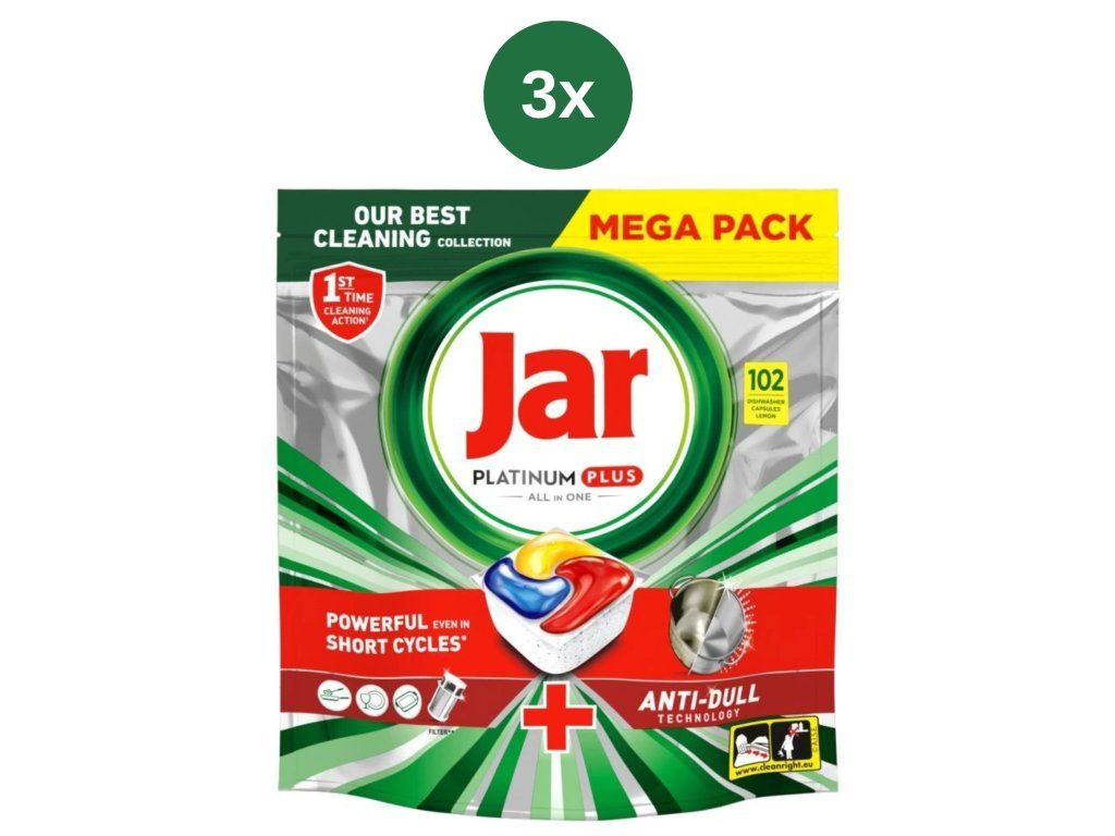 Kapsle Jar Platinum Plus Vše v jednom do automatické myčky nádobí zanechávají nádobí čisté jako nové, zaručují nejlepší čisticí účinky od Jaru a dokonce pomáhají odstraňovat zašedlost vznikající časem a obnovují původní lesk nádobí. Kapsle Jar Platinum Plus mají zabudovaný systém předmývání, takže nádobí nemusíte předmývat sami. S kapslemi Jar Platinum Plus nebudete muset nádobí předmývat, ušetříte více vody a budete šetrnější k životnímu prostředí. Jar spojuje v jedné účinné kapsli tekutý i práškový prostředek na mytí nádobí. Vysoce rozpustný obal se rychle rozpouští a funguje dobře i při krátkých cyklech, takže nádobí se začíná ihned umývat. A navíc se kapsle tak snadno používají. Kapsli není třeba rozbalovat a stačí ji jen vložit do dávkovacího zásobníku na mycí prostředek.